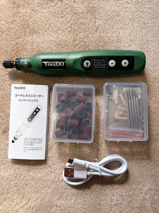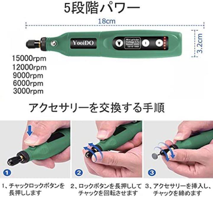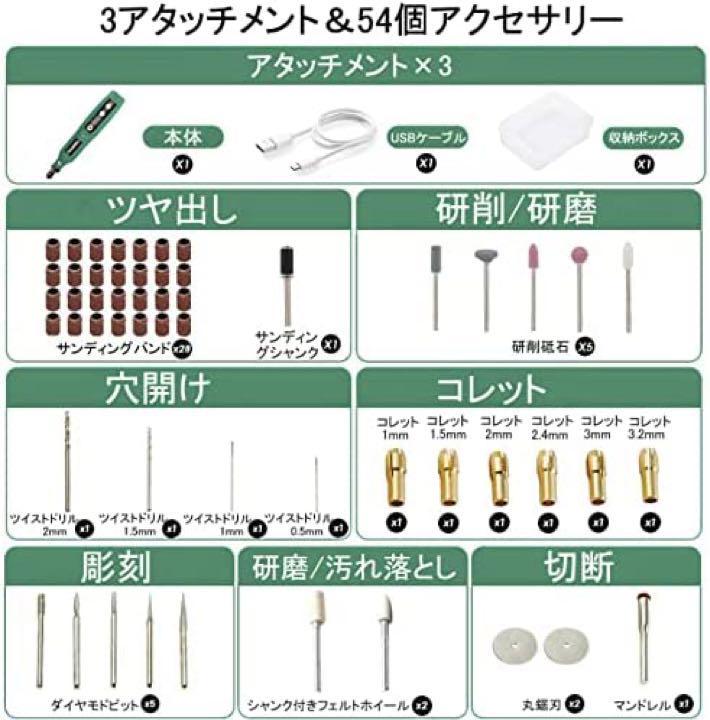★新品未使用★ 【USB充電式&コードレス】 コードレス式で、作業中にコードに邪魔されない。リチウム電池を採用して、普通なMirco USBで接続して充電できます。電池容量は2000mAhで、2時間(無負荷)作業し続けられます。 ガラス彫刻や金属研磨・穴あけ・つや出し・模型工作などに対応できる、DIYや趣味など幅広い場所で使い勝手よく楽々。 【5段変速可能&低騒音】 5段階の変速ができ、3000&6000&9000&12000&15000RPM/分に達せられるので、作業内容や材料に合わせて調節でき、最適な回転数で彫刻/穴あけ/研磨/切断/切削/汚れ落としなどの様々な作業を楽々にします。 またペンみたいなサイズで、握りやすくて快適さが感じられます。自宅でリューターを使用する場合には、騒音としては少ないですし、自宅で静音性に優れたものとして安心的に使用することができます。 【54PCS付属品&多種多様な用途】 ビット54 個のアクセサリーが付属しており、サンディング、カット、サンディング、彫刻、研磨、穴あけ、ネイル アートなど、さまざまな家庭用プロジェクトや手作業の作業に使用できます。 ペン型ミニリューターは先端に様々なビットを取り付けて、回転させることで色々な用途に使えるりゅーたーです。彫刻や彫版・研磨・研削・艶出しや汚れ落とし・研きなどの用途でご利用いただけます。 小型や軽作業に向いているため、多くのホビーユーザーに重宝されております。 【軽量&照明ライト付き】 ミニルータービットはペンサイズなので、片手でも簡単に作業できます。握りやすいハンドルは、長く使用しても疲れを感じさせません。 140gの軽量でコードレスなので家だけでなく、屋外でも作業できます。軽いので細部の彫刻には特に最適、工作やアクセサリー作りなどに便利です。 本充電式リューターはLEDライトも付き、夜や暗い場所のところで作業する時に、ライトをオンにすれば、はっきり作業することができます。 【豊富なアクセサリー】 豊かなビットを付属して、1×ミニルーター、1×アクセサリーケース、54×アクセサリー 1*USB充電ケーブル、1*取扱説明書。 #彫刻 #研磨 #切断 #掘削 #洗浄 #初心者 #スターターキッド #ルーター #ミニルーター #リューター #ミニリューター #コードレス #充電