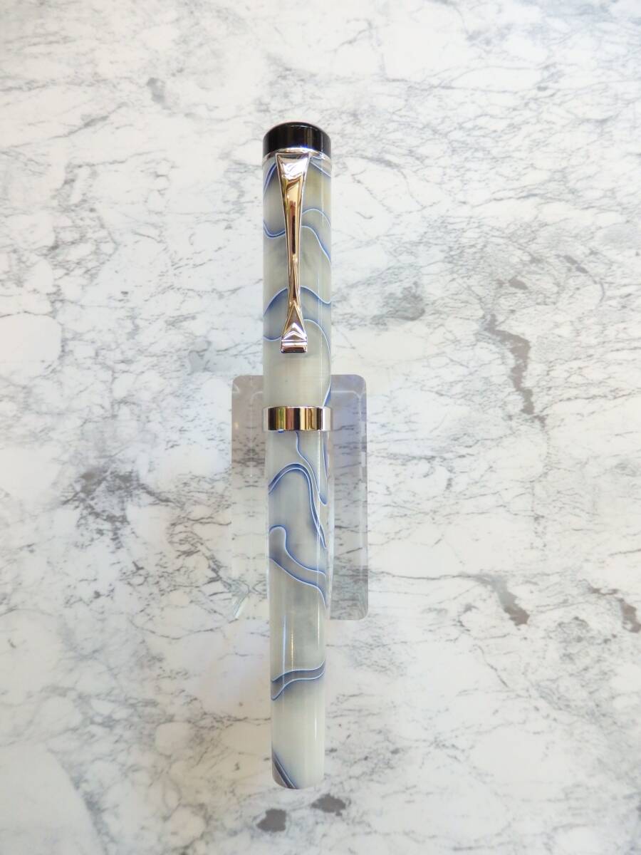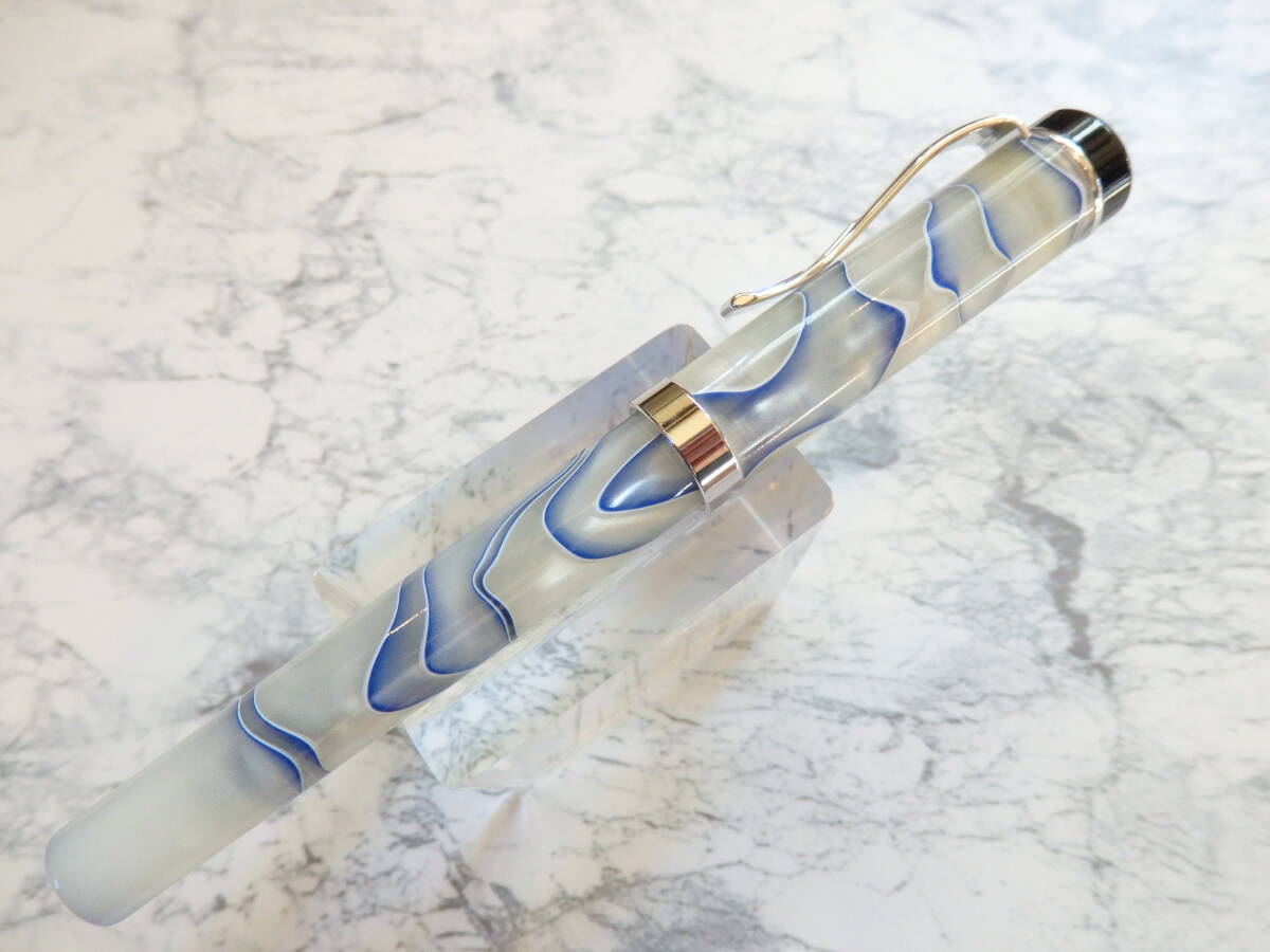 グレイ・ブルーレジンに水の流れを現わした万年筆です。
