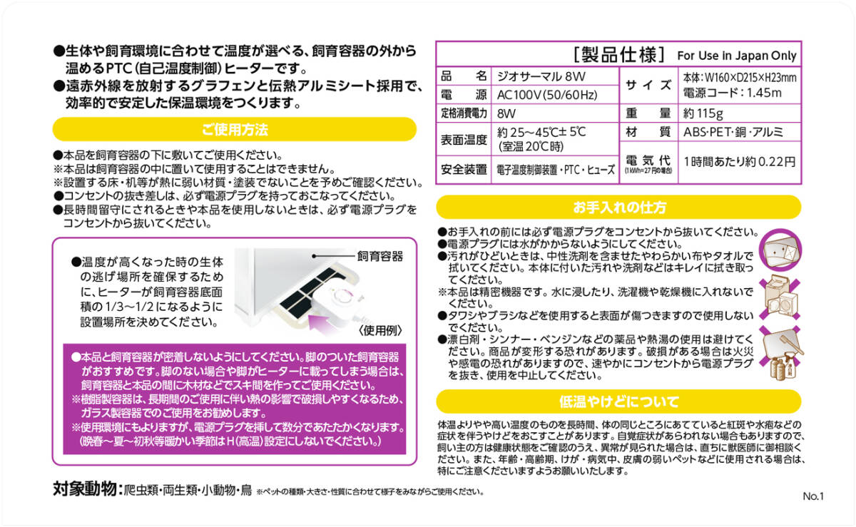 背面が伝熱アルミシートで覆われておるので、この背面がメタルラック等の熱伝導率が高い素材でできている棚にじかに触れると、というかじかに置くと、伝熱アルミシートの影響で棚にも熱が伝わり放熱してしまう恐れがございます。ショップなどでメタルラックを使っているお店が多々ございますが、あれはショップ全体を空調で温めているから全然問題ないのです。冬、暖房を付けていない部屋のメタルラック等を触ってみてください、ひじょーに冷たいです。そこに熱伝導率の高い伝熱アルミシート付のパネヒを直接敷くと、熱を棚全体にとられてしまうと思いませんか?そもそもヒーターは温度を上げるためのものなので、夏に熱くなる部屋の話は置いときますが、それも生体の好む温度と部屋の温度しだいだと思います。なお、棚とジオサーマルの間に保温材などを敷いて断熱して使用すれば、個人的には非常におすすめのパネルヒーターです!! メーカーにジオサーマル用の断熱材を作ってもらえるよう嘆願してみます。その断熱材が発売されたならば、マルカンさんは売上だけを考えるメーカーではなく、エンドユーザーさんの意見を聞き入れ、良い商品を作る良いメーカーとして、レプシーの商品をたくさん買うことで評価していただければ幸いです。