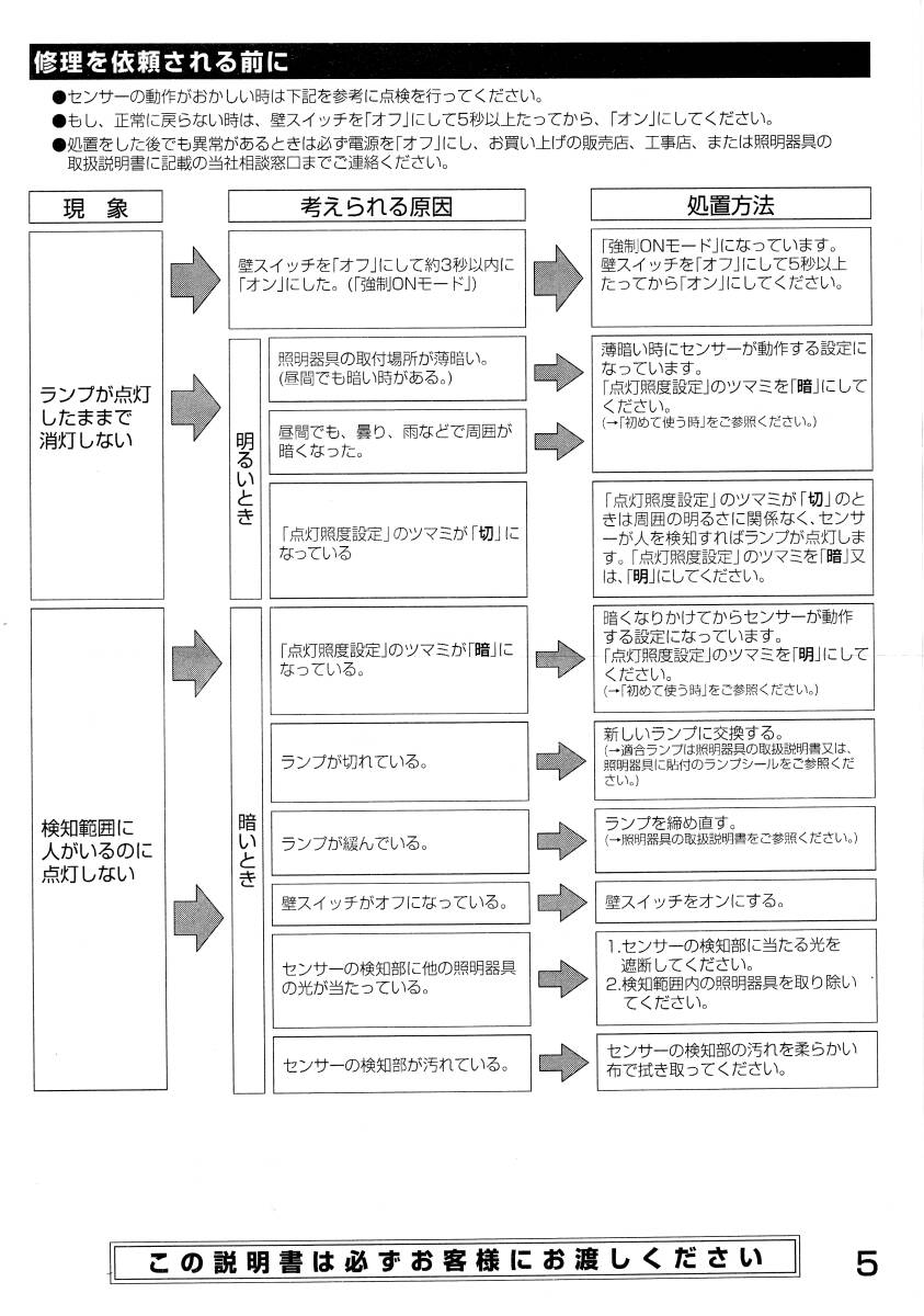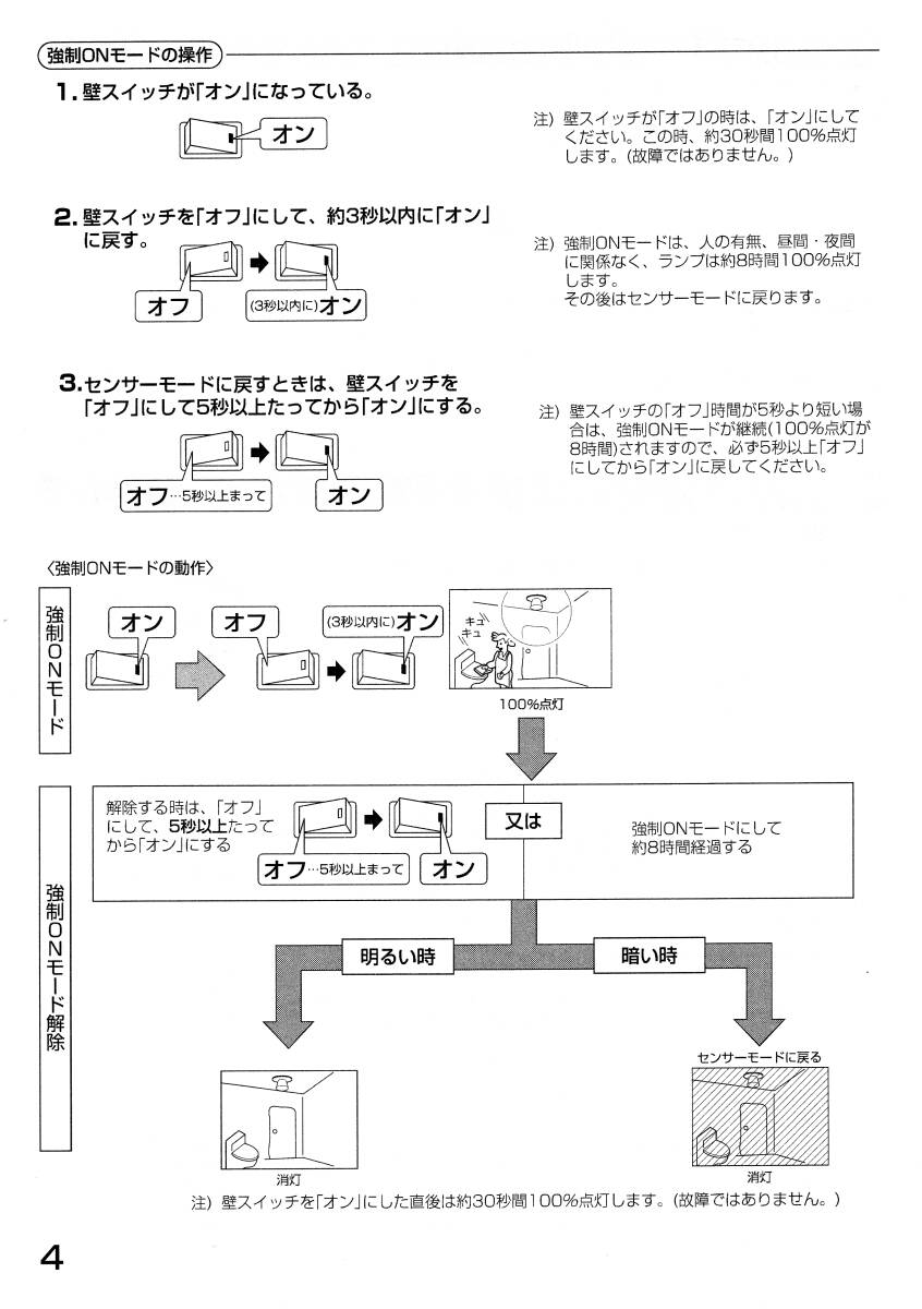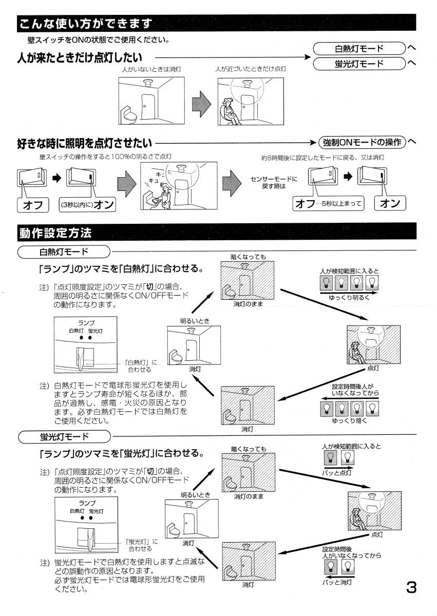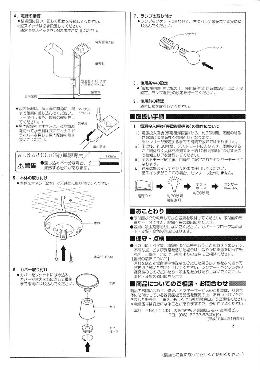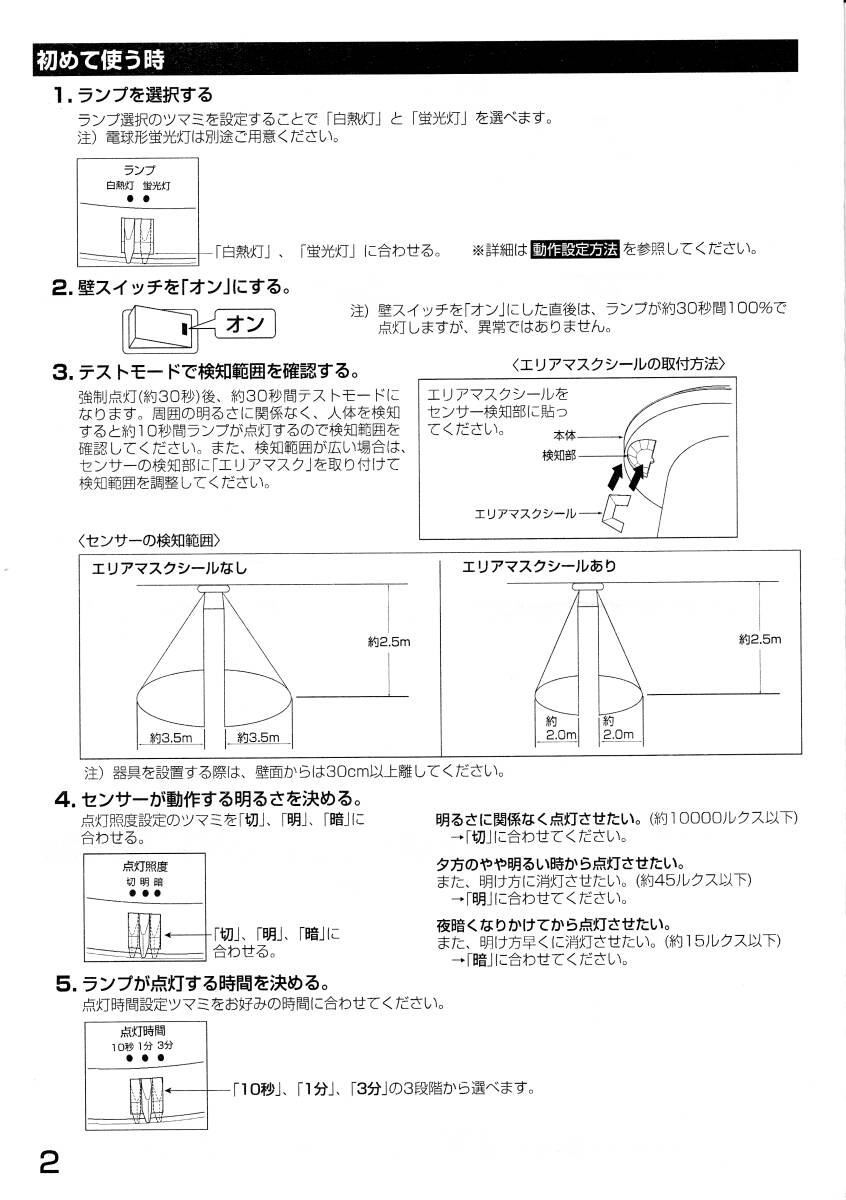 説明書は附属しません。添付の説明書を参照下さい。ランプは付属しません。正常動作します。 多少キズがあります。 センサーが人を検知するとランプが100%点灯します。ランプは人がいなくなると設定 された点灯時間(10秒、1分、3分)経過後消灯します。点灯保持時間が選べます。