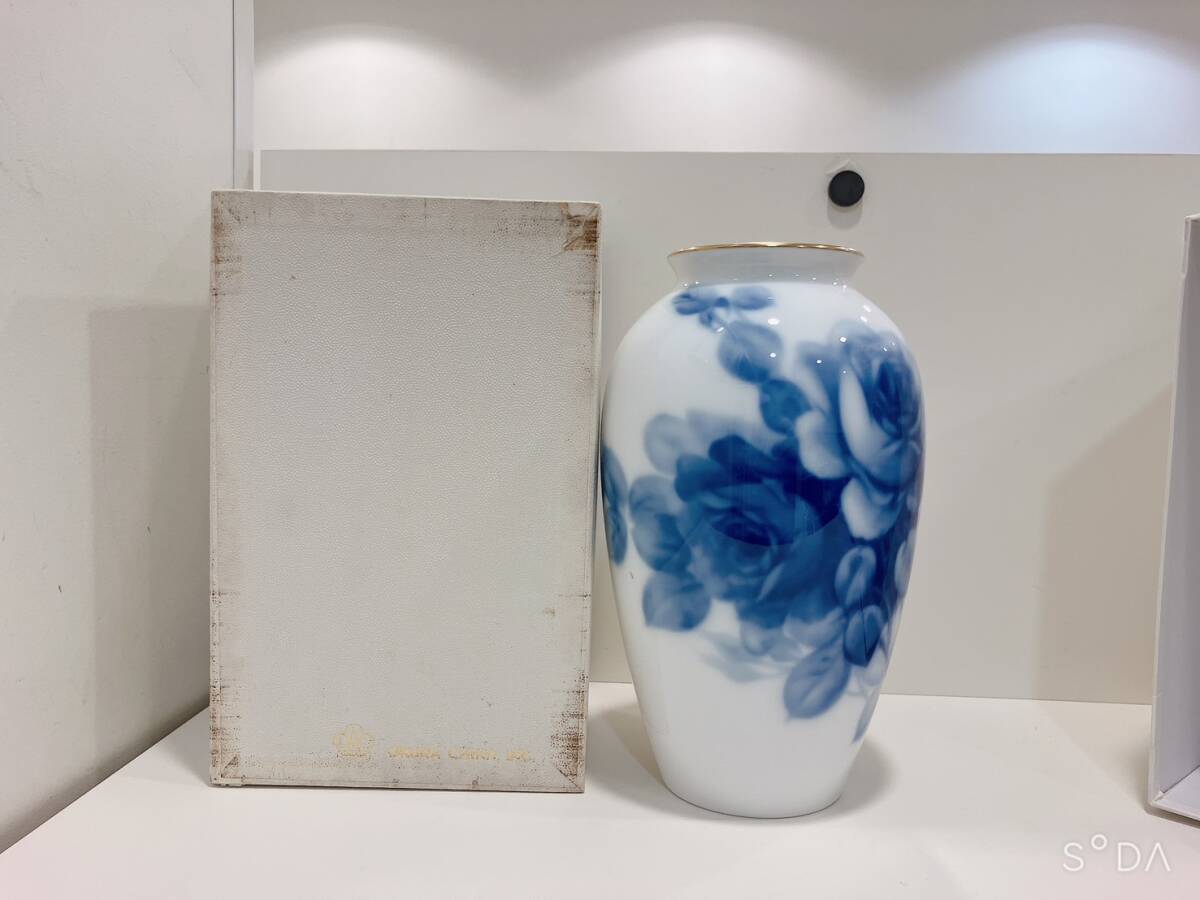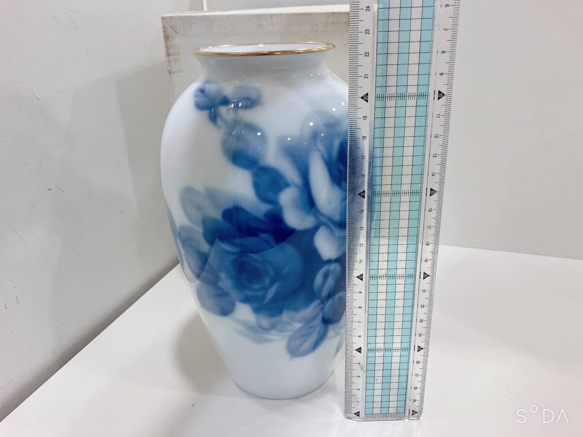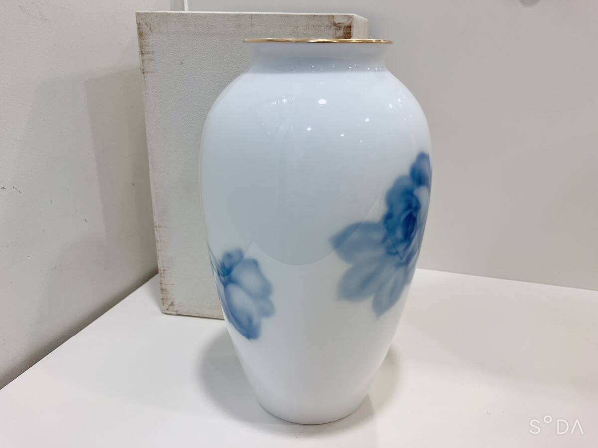 ◆【未使用】大倉 青 薔薇 バラ 花柄 白磁  花瓶 23㎝