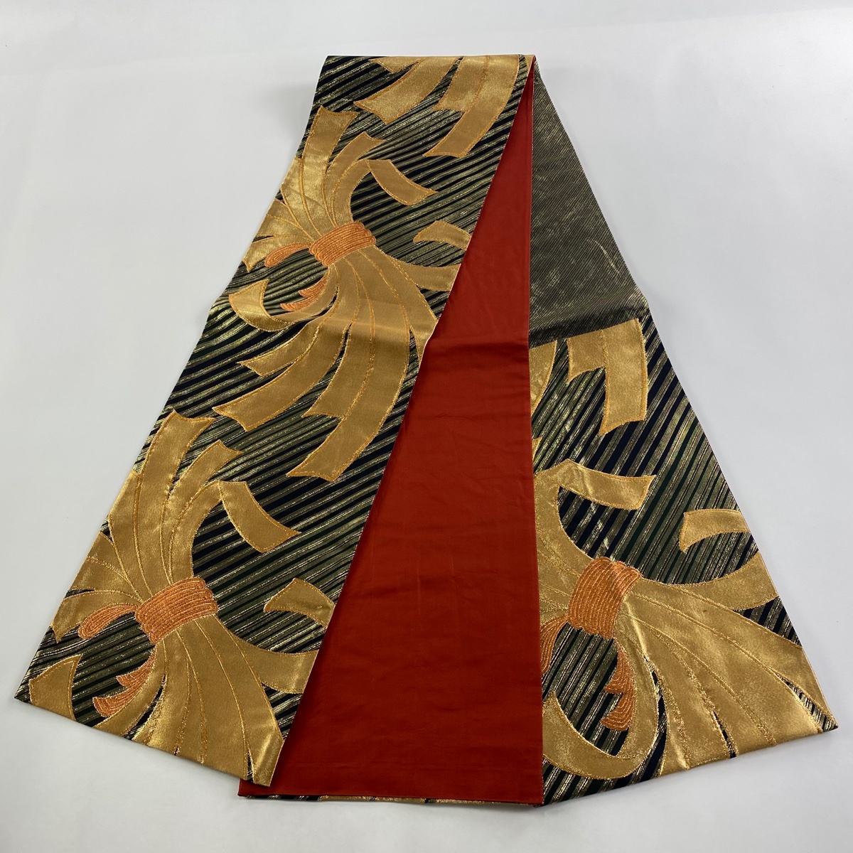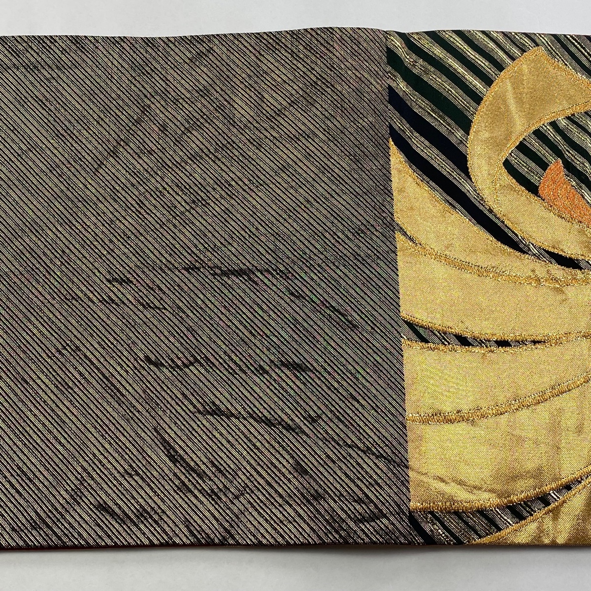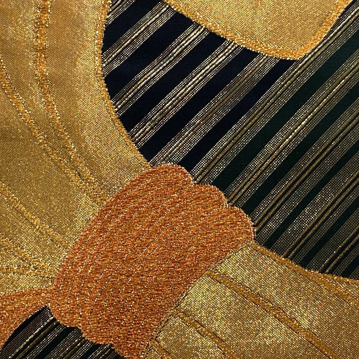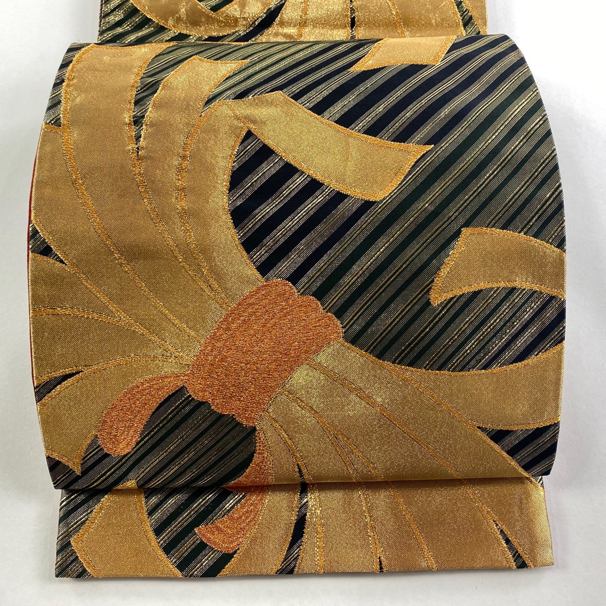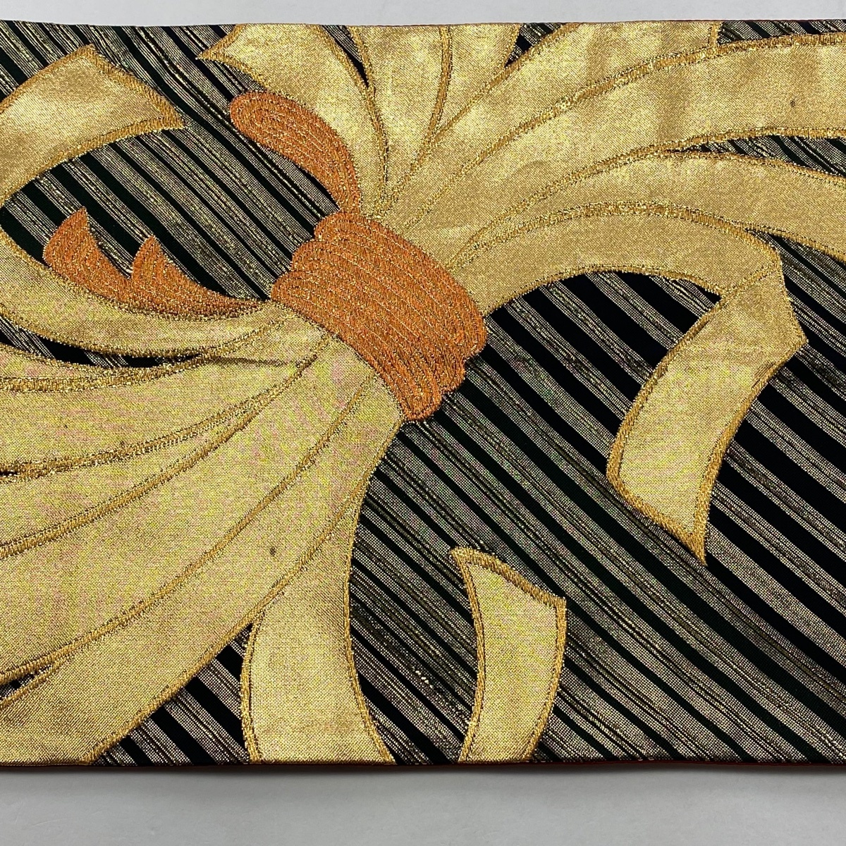 | 袋帯 美品 秀品 束ね熨斗 斜縞 金糸 箔 黒 六通 正絹 【中古】 |