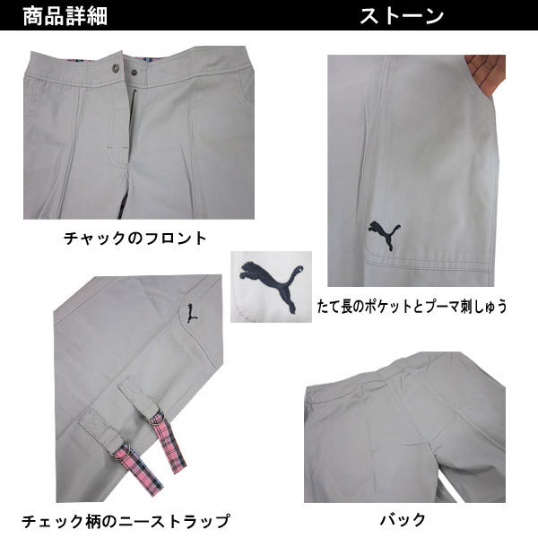 PUMA(プーマ)レディース Knee Strap パンツ・ストーン(M)です。 ■素材 コットン100% ■サイズ ウエスト約80cm、ヒップ約106cm、太もも周り約60cm、股下約81cm、総丈約102cm また上約23.5cm すそ幅約26cm。 ■特徴 サイドラインに付いたチェック柄のストラップが印象的なドレッシーなコットンパンツで、脚長スタイルの出来上がりです。 モデル身長166cm Mサイズ着用 | ||||||