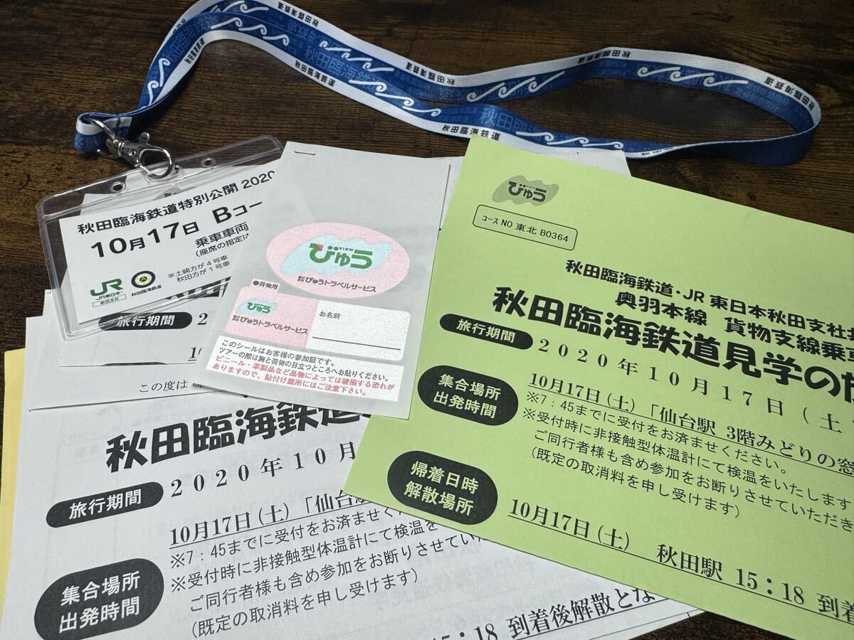 廃止になった秋田臨海鉄道の見学ツアー用ストラップと行程表等のセットになります。