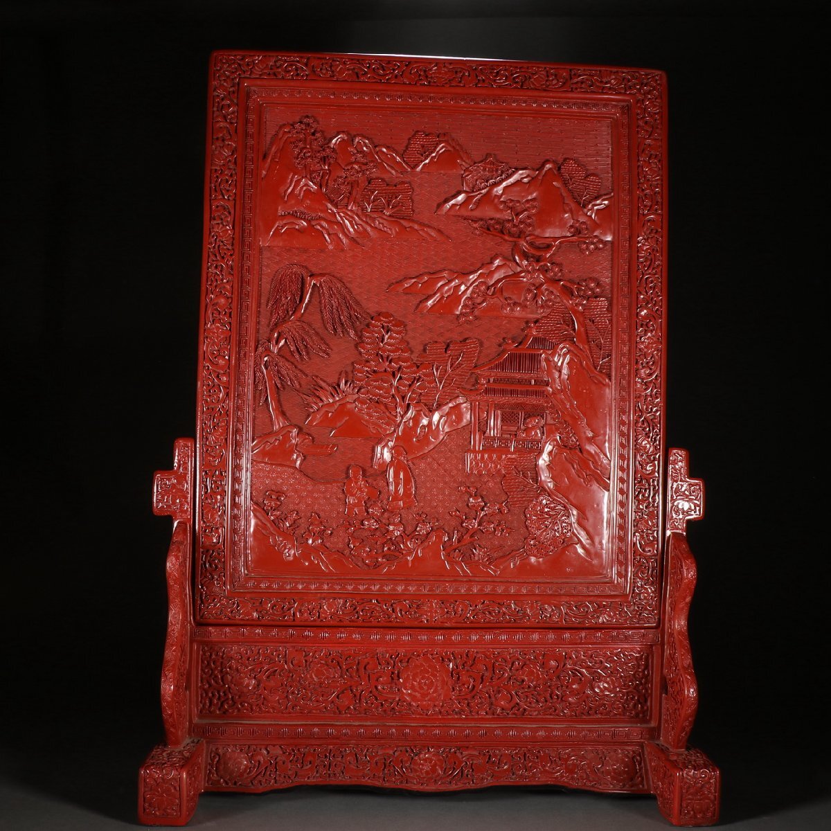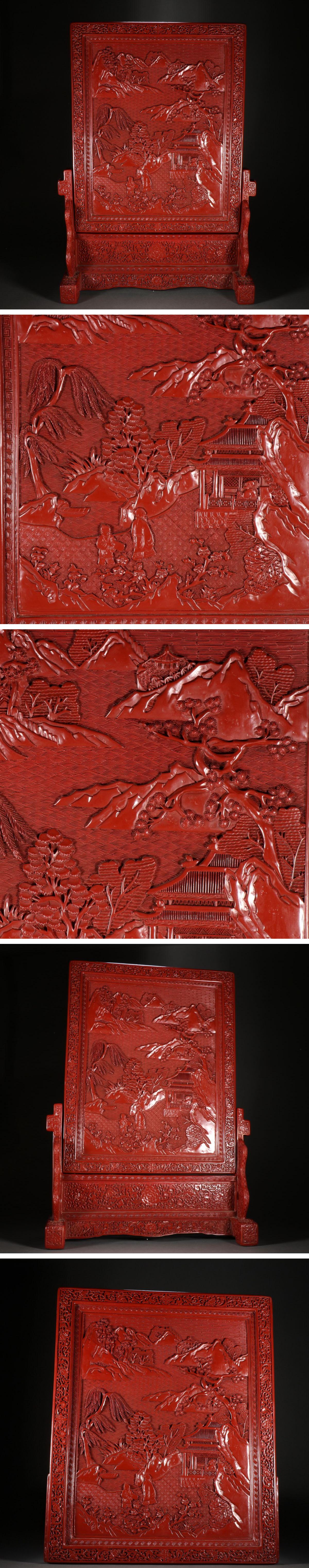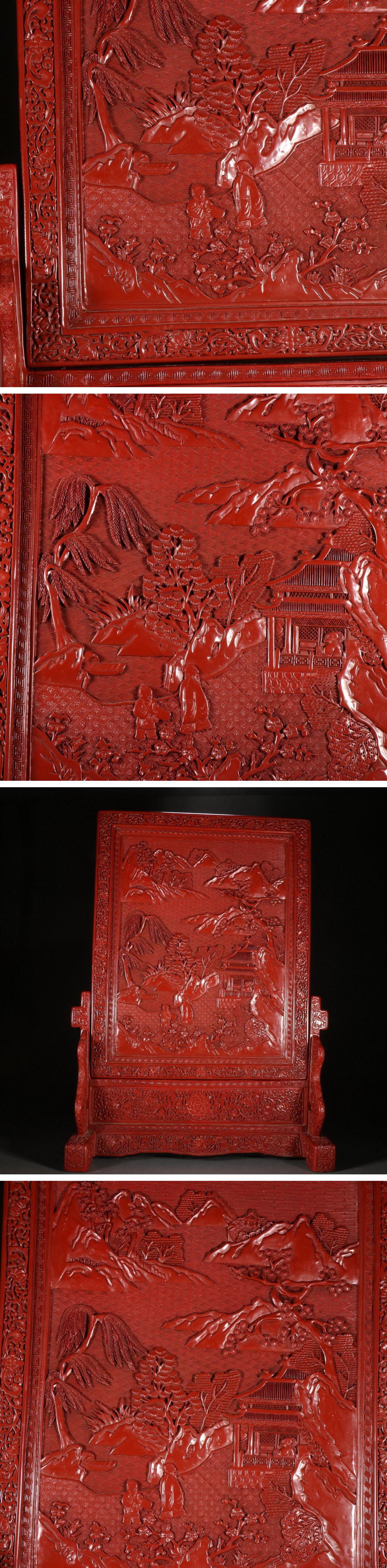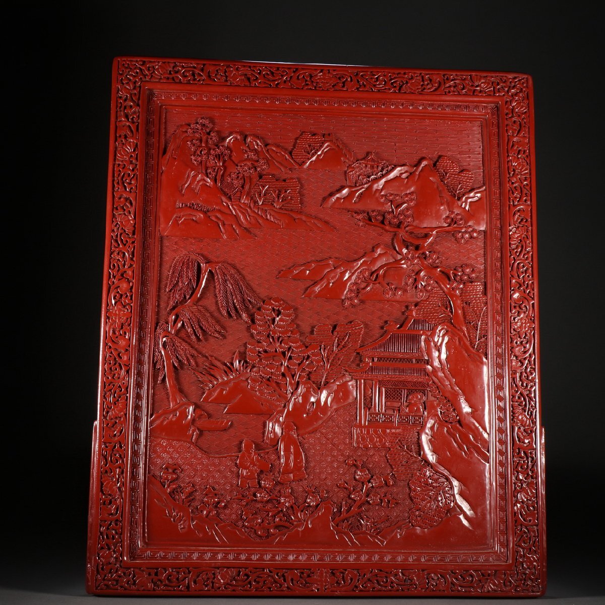 【清】某有名オークション購入 清時代 堆朱雕漆 山水人物紋巨大挿屏 古置物 古擺件 古美術 時代コレクション7L9-OG14