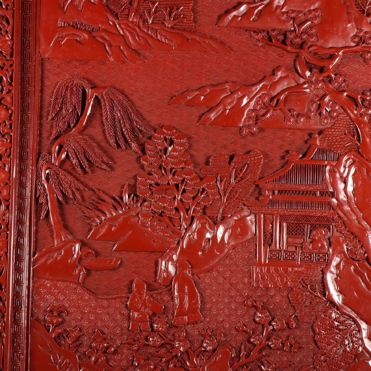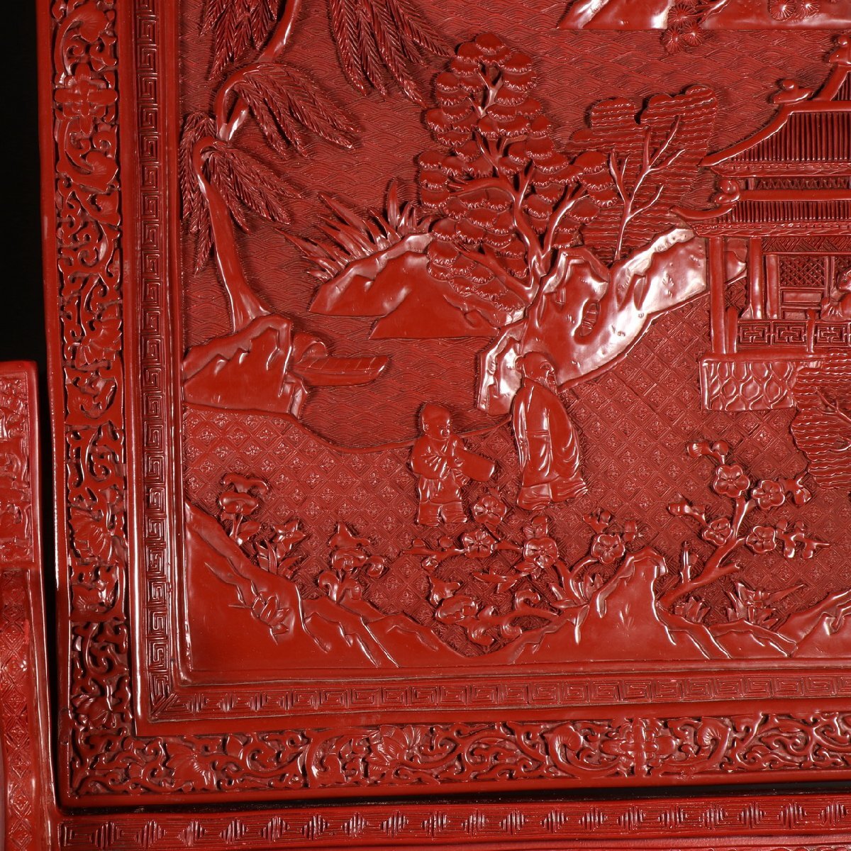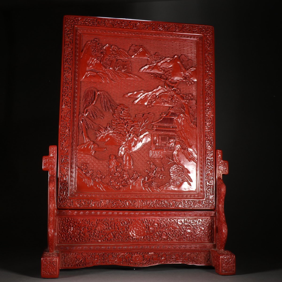 【清】某有名オークション購入 清時代 堆朱雕漆 山水人物紋巨大挿屏 古置物 古擺件 古美術 時代コレクション7L9-OG14