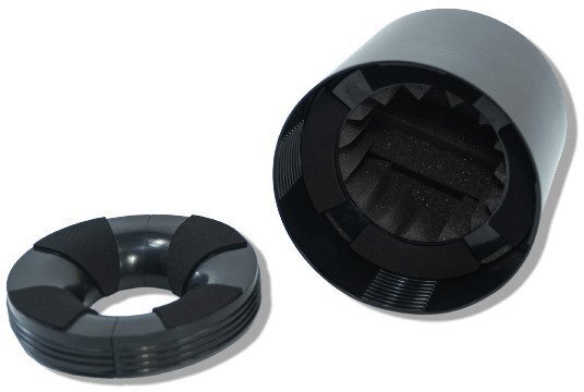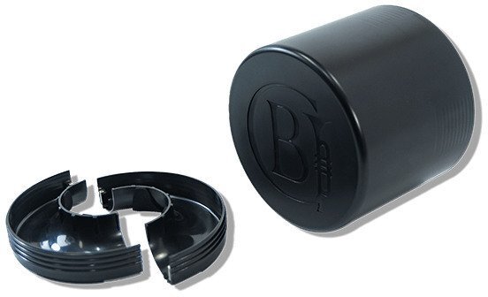 2.脱着も簡単:「ホームミュート」のフタ部分をまわして外します。フタ部分は2つのパーツに分かれており、磁石により接合されているためトランペットへの装着・脱着が簡単に行えます。