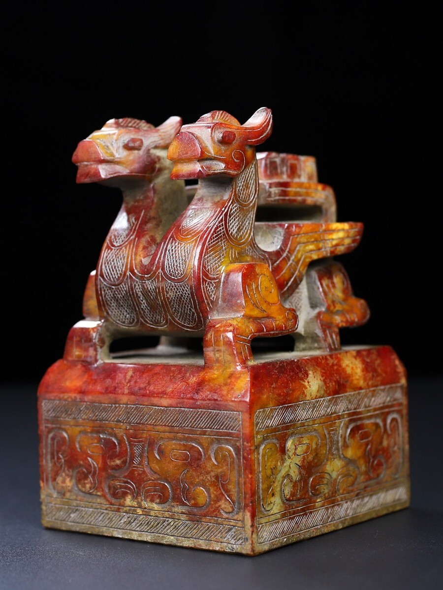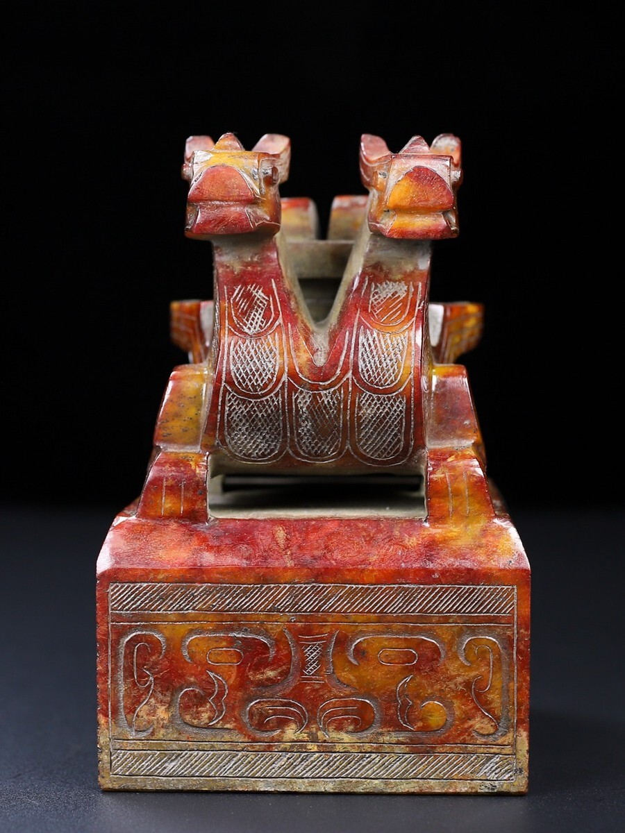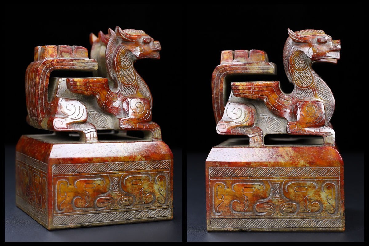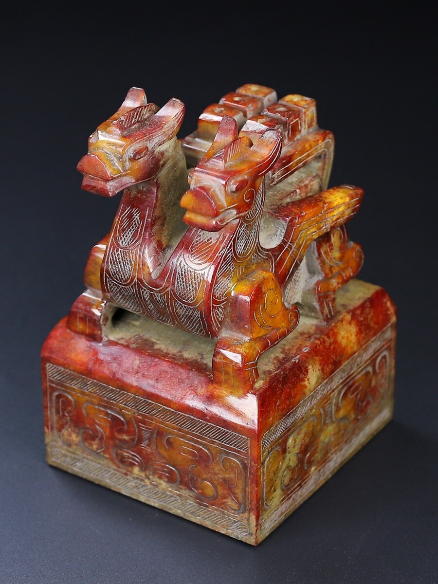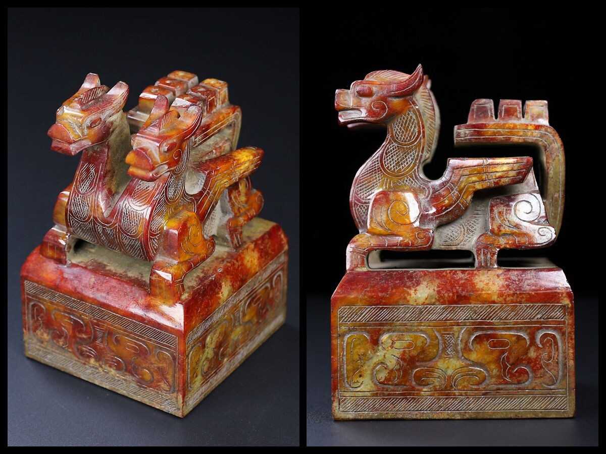 「時代物 和田玉 高古玉彫り 双頭古獣印章」極細工 賞物 中国古美術 旧蔵出