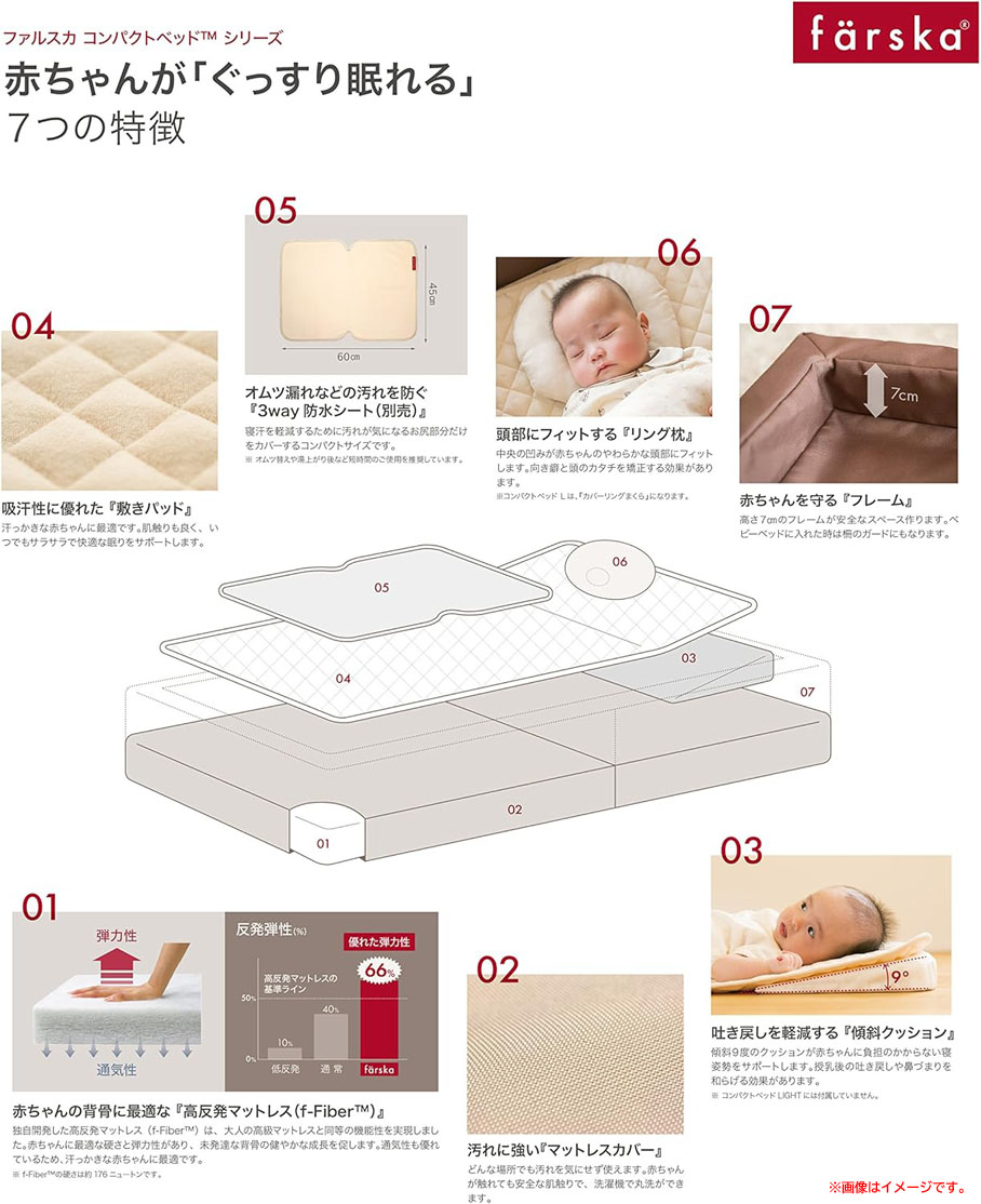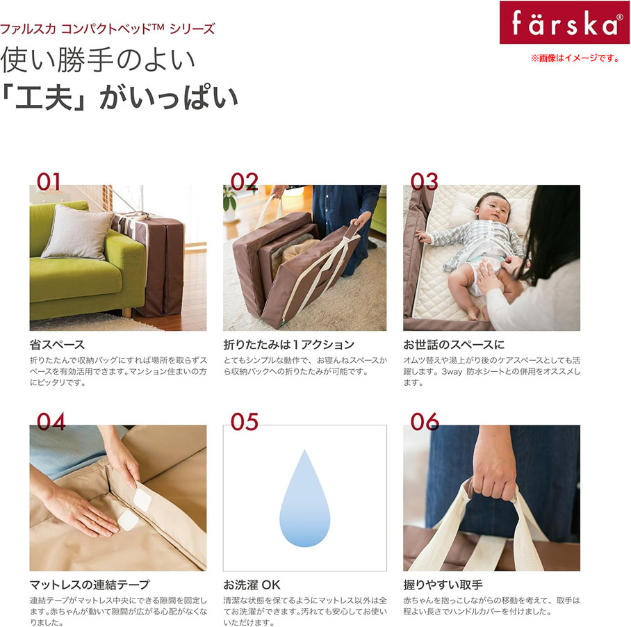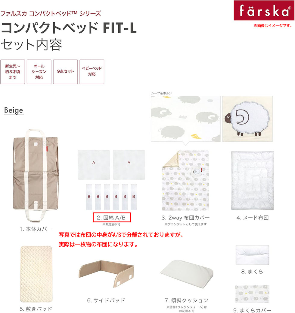 【商品特長】 ママたちの声を活かしてより使いやすくリニューアルした ファルスカ コンパクトベッド フィット シリーズのラージサイズ 「L」 ・ベビーベッド・お布団を用意しなくても、これ1つでOK ・いつも寝ているお寝んねスペースをどこへでも持ち運べます。リビングから寝室の移動、里帰りや旅行などに便利です! ・ワンアクションでブランケットや枕を収納するバッグになります。 ・お寝んね/お世話/お遊びマットなどいろんなシーンで活躍します。 | |||||||||||||||||