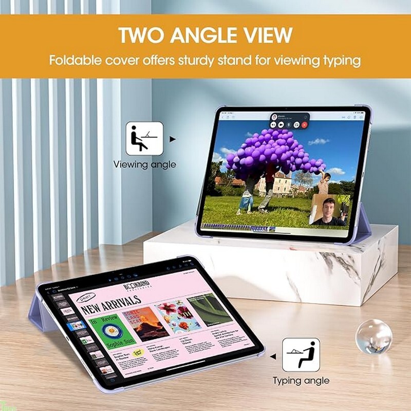 三つ折りのフロントカバーが視聴やタイピング時の立ち位置を調整します。