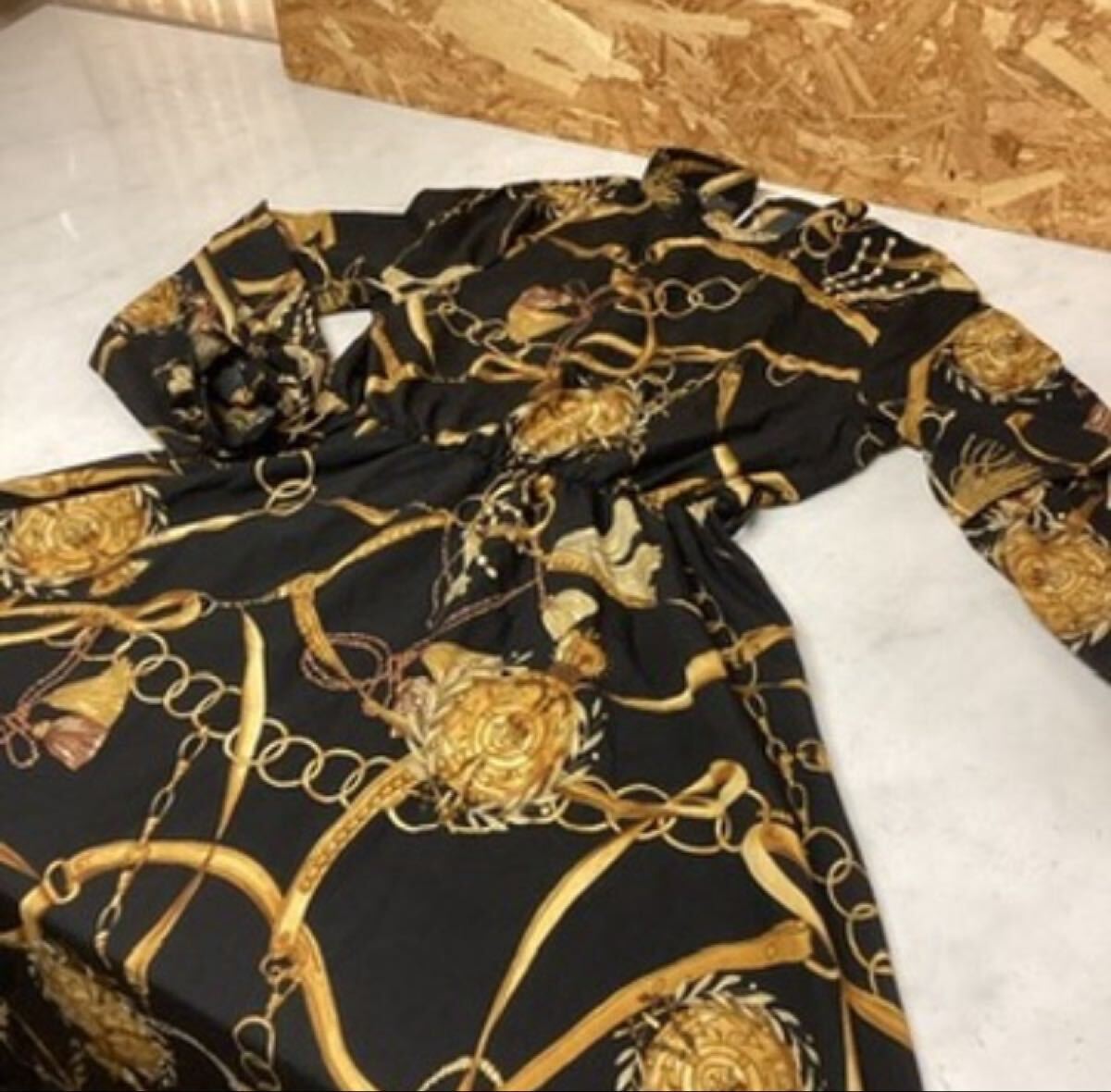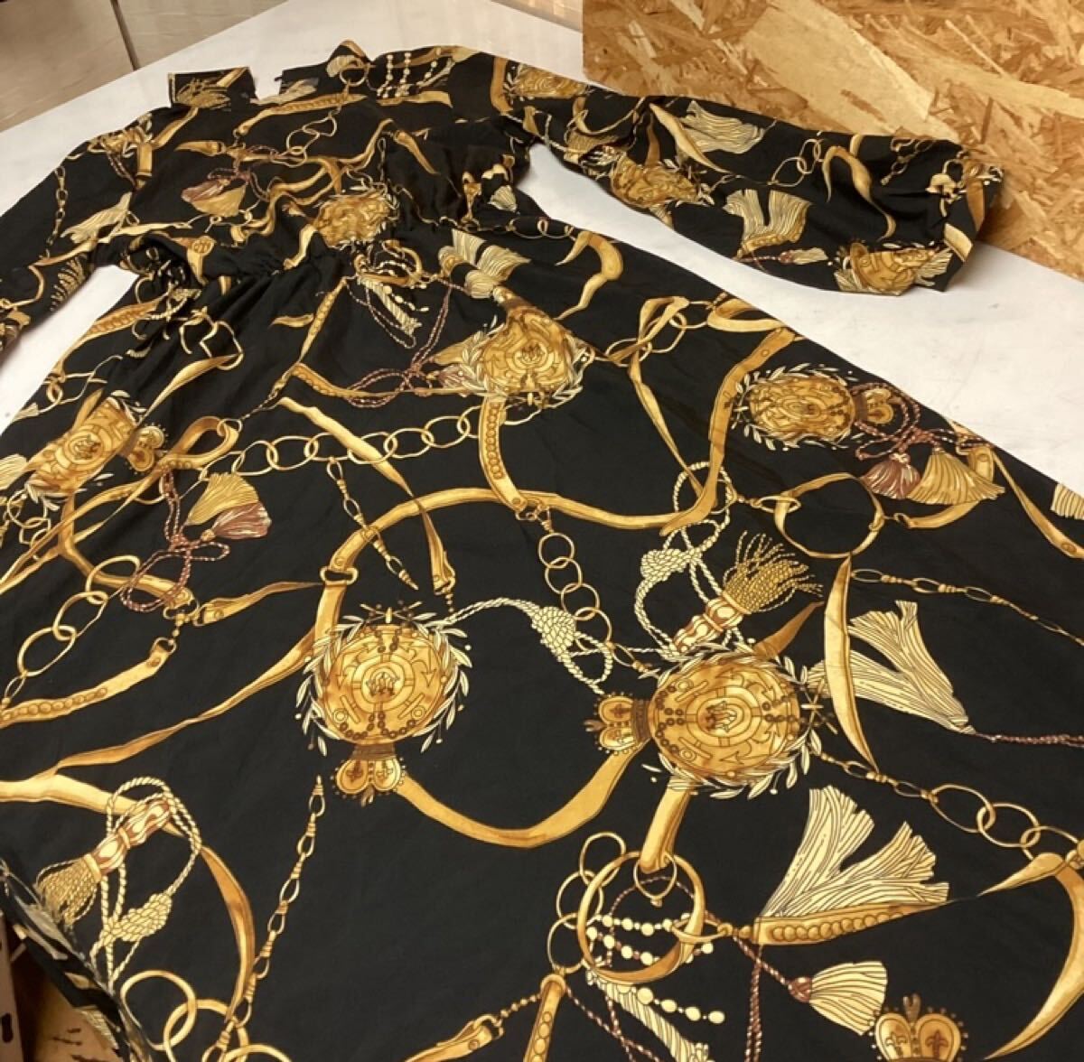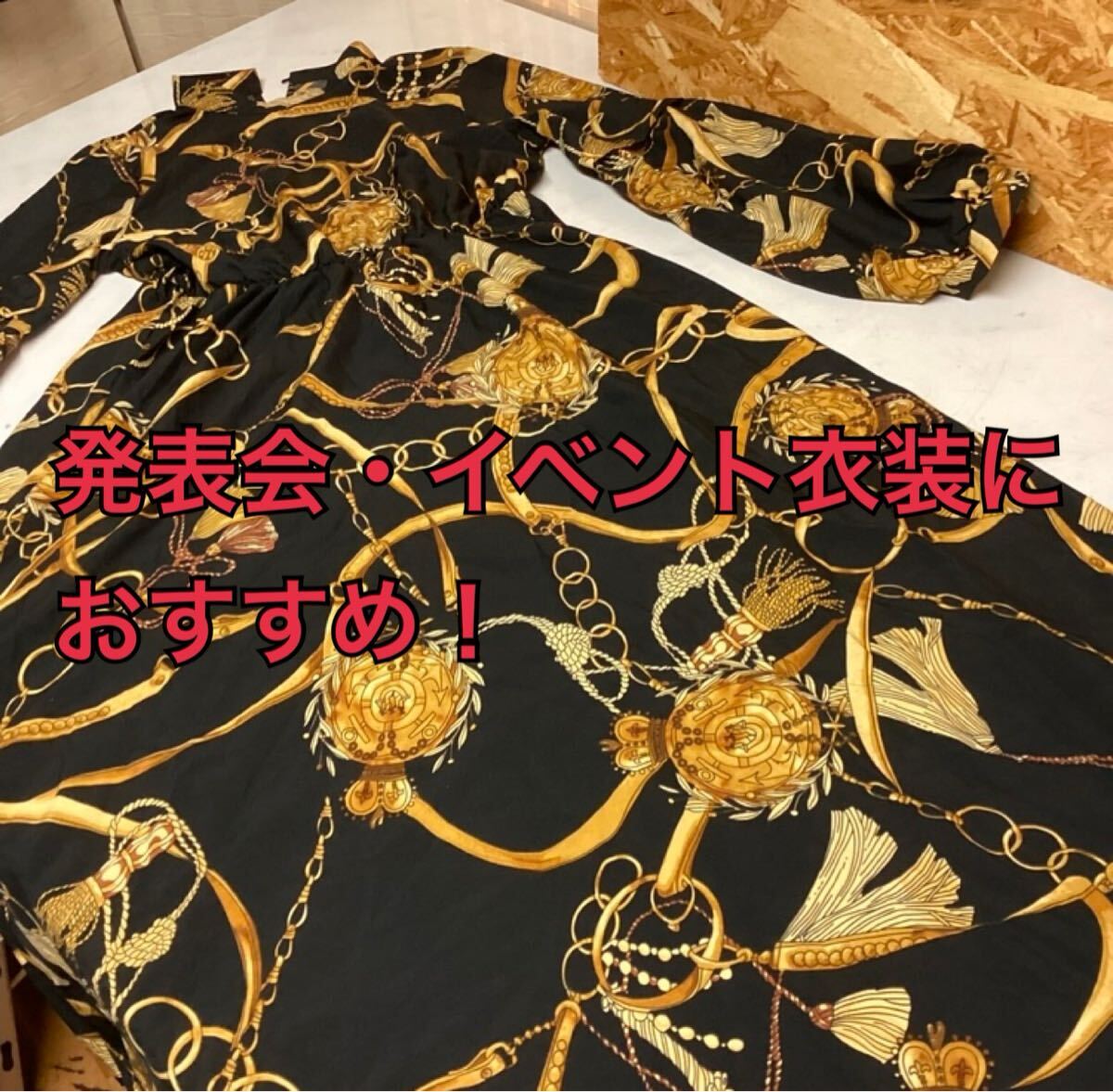 ステージや発表会などにも映える豪華柄のワンピースです。サイズMで華やかな印象を与えるデザイン。イベント衣装やパーティーシーンにもおすすめです。使用感はありますが、まだ十分着用いただけます。未清掃品のため現状渡しとなります。