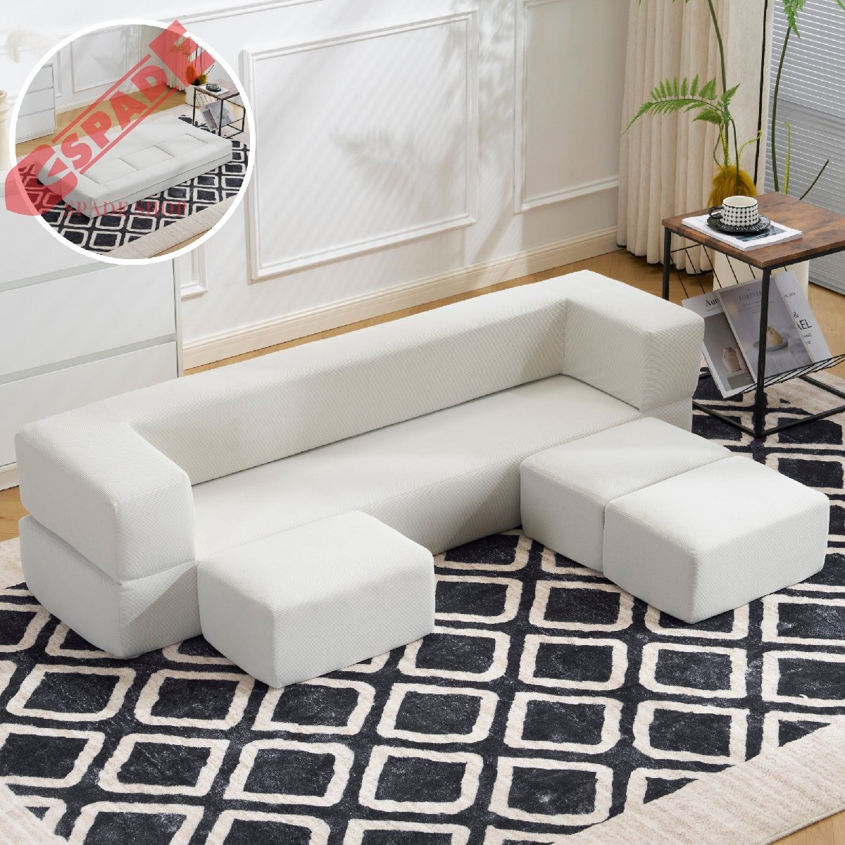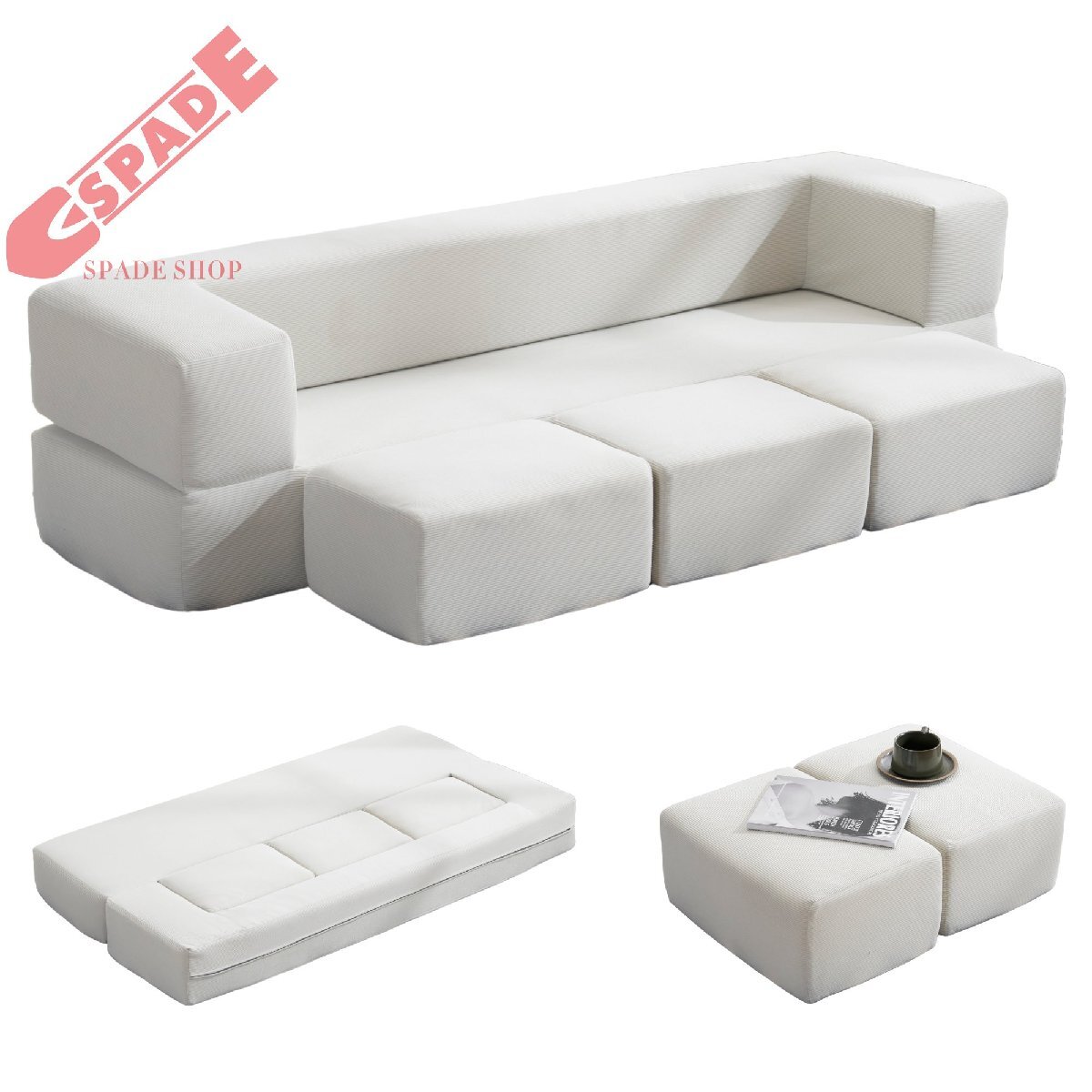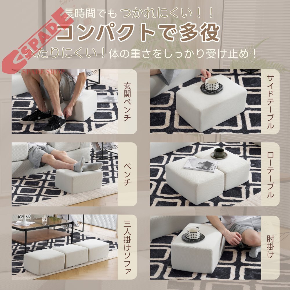 • 【多機能構成】このソファは、折りたたみ式のソファ1台と、小型スツール3台で構成されています。合計5人まで快適に座れる設計で、スツールはミニテーブルやサイドテーブルとしても活躍します。