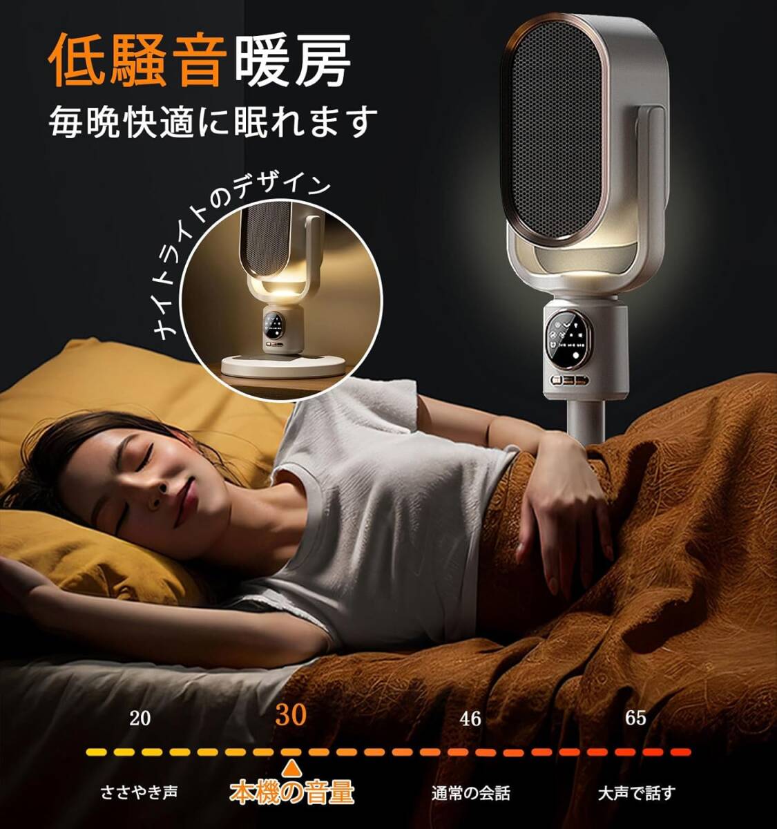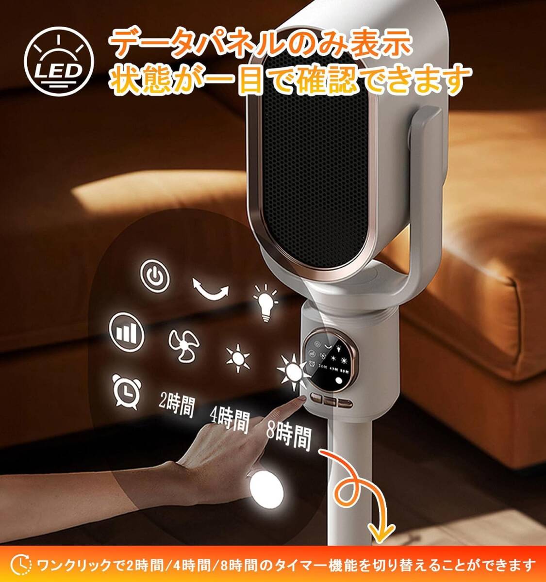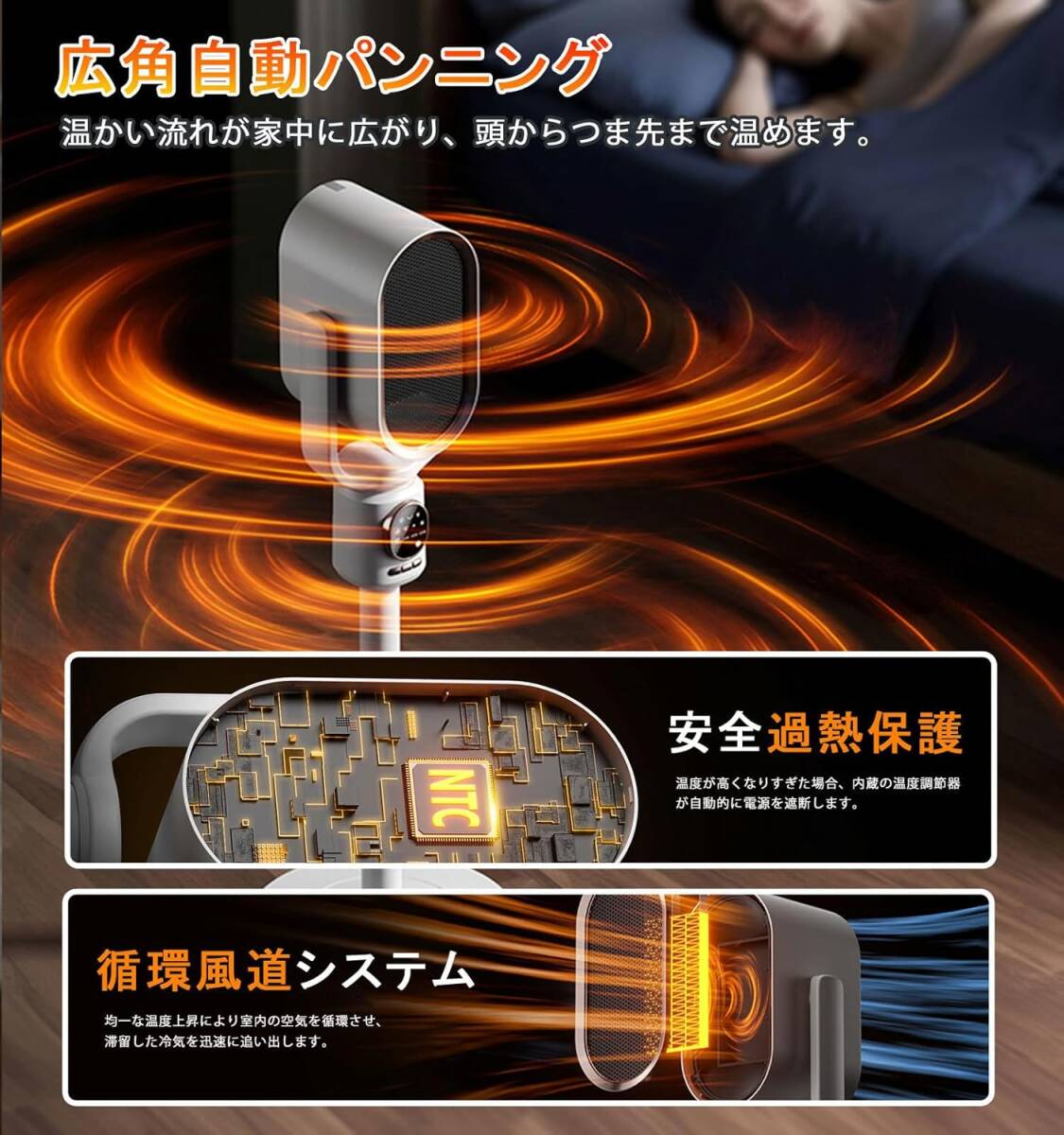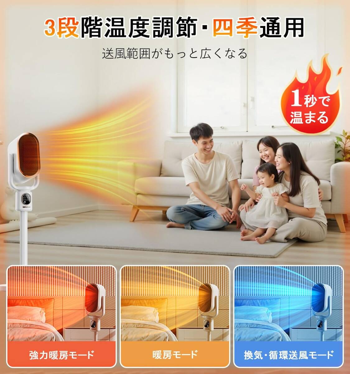 【2秒即速暖&DC省エネ性能 ファンヒーター】 最新PTCセラミックヒーター(1500W)搭載で、電源ONからわずか2秒で温風がお部屋全体に行き渡ります。自然送風モード(5W)/暖風(1100W)/熱風(1500W)の3モード切替可能で、冬はぽかぽか温風と季節を問わず活用できます。110°の自動左右首振り機能と110°の手動上下調節を組み合わせることで、足元から胸元までムラなく暖房。就寝時にも便利な優しい光のナイトライト内蔵で、真冬の夜も暖かく安全にお過ごしいただけます。省エネ設計で電気代を最大30%削減可能なスマートヒーティング制御を採用しています