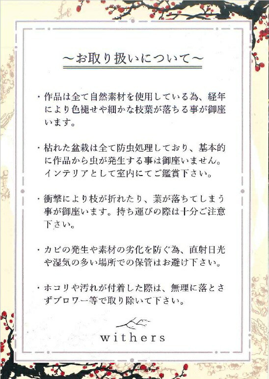 | 商品紹介 | 【withers bonsaiとは】 破棄されてしまう枯れた盆栽を回収し、その美しい樹形をそのままドライ化する事で、枯れない盆栽アートとして再生しました。 独自の保存技術により葉や花は乾燥させる事なく、自然に近い状態を保ったまま室内にて鑑賞頂けます。 |