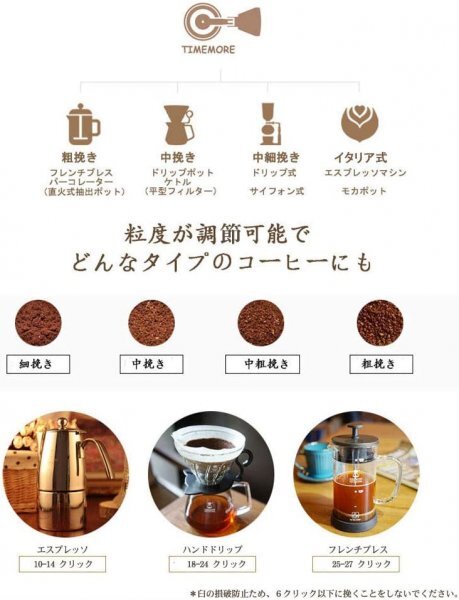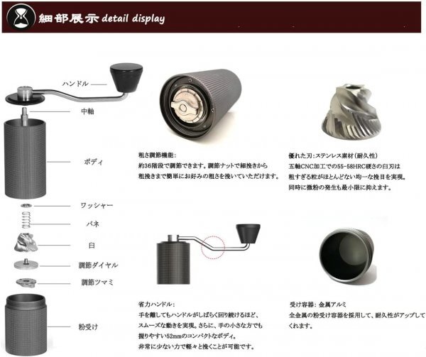 1.ブランド:TIMEMORE 型番:栗子C2MAX 素材:外部:アルミ金属 刃:ステンレス 一部分:PC サイズ:本体172x52mm ハンドル:159mm 容 量:約30g 重 量 :約505g