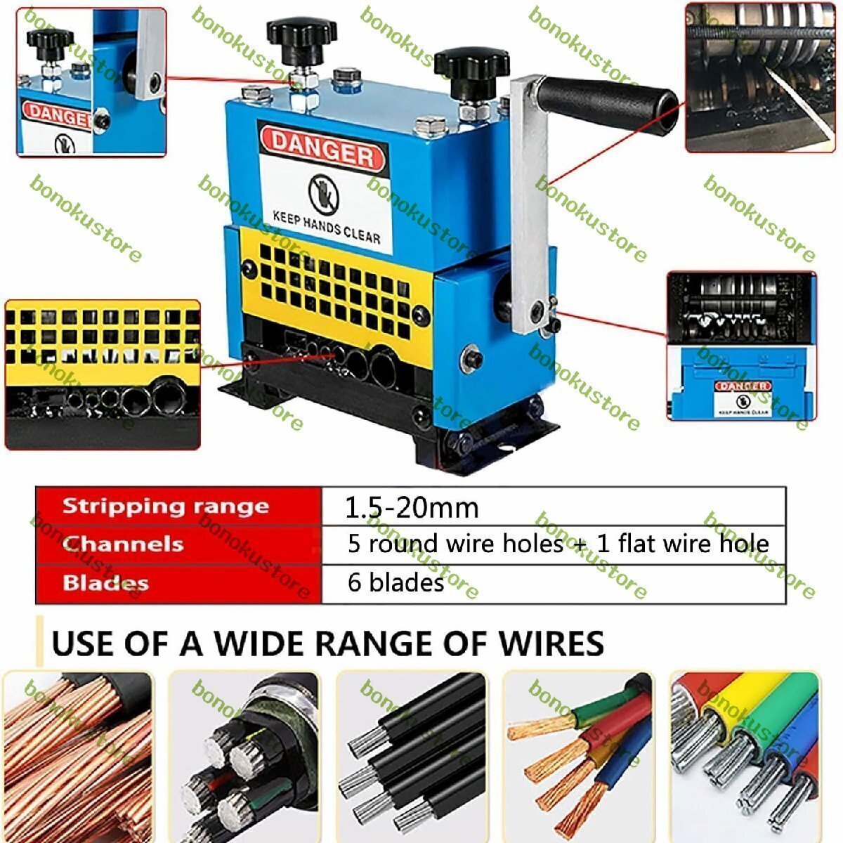 互換性: 調整可能なブレードとローラーは直径 1.5 mm ~ 20 mm のすべてのワイヤ サイズに適合します。