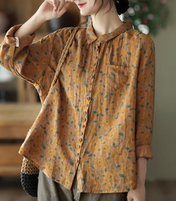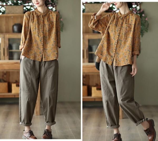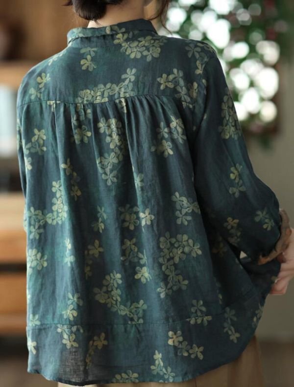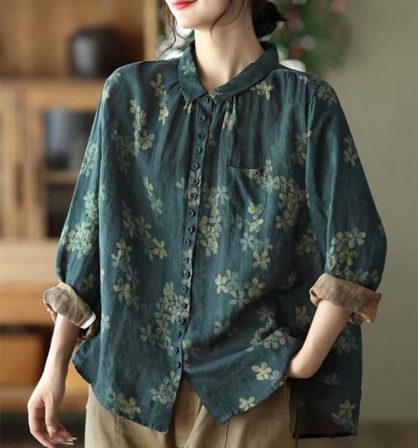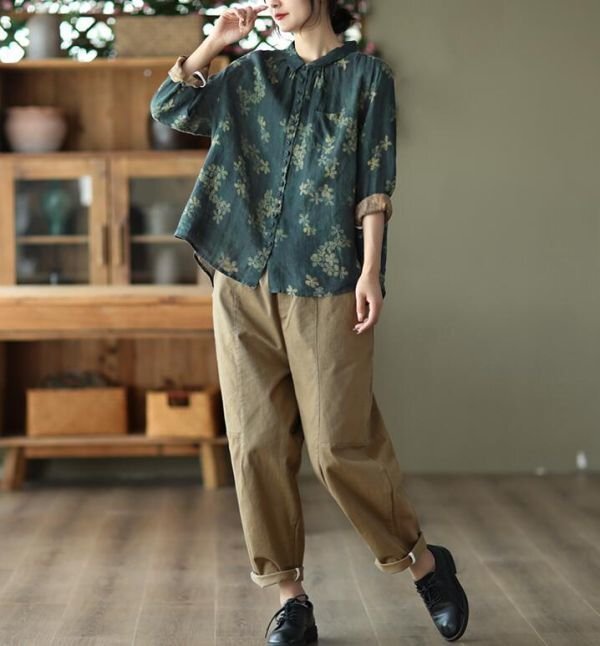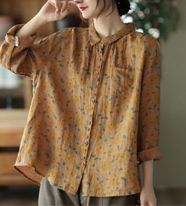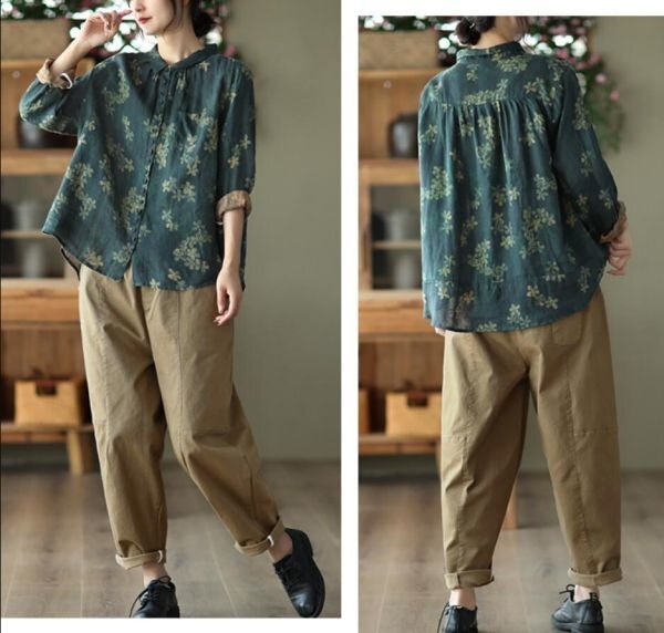 ブラウスシャツ レディース チュニック カジュアル ゆったり プリント 長袖シャツ トップス ★ブルー /Mサイズ
