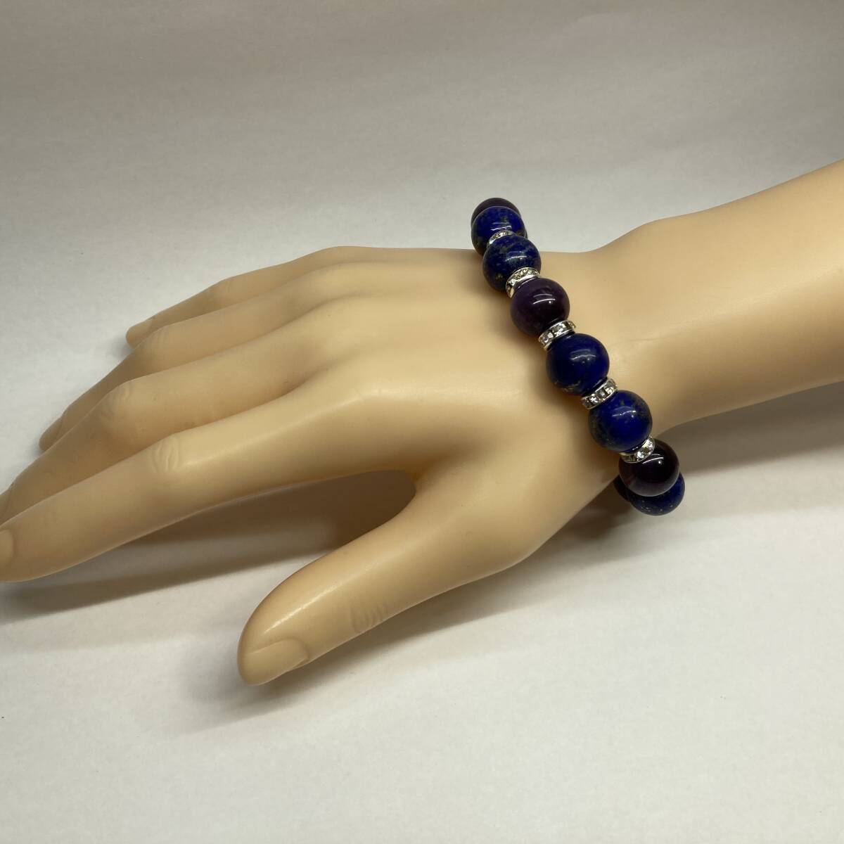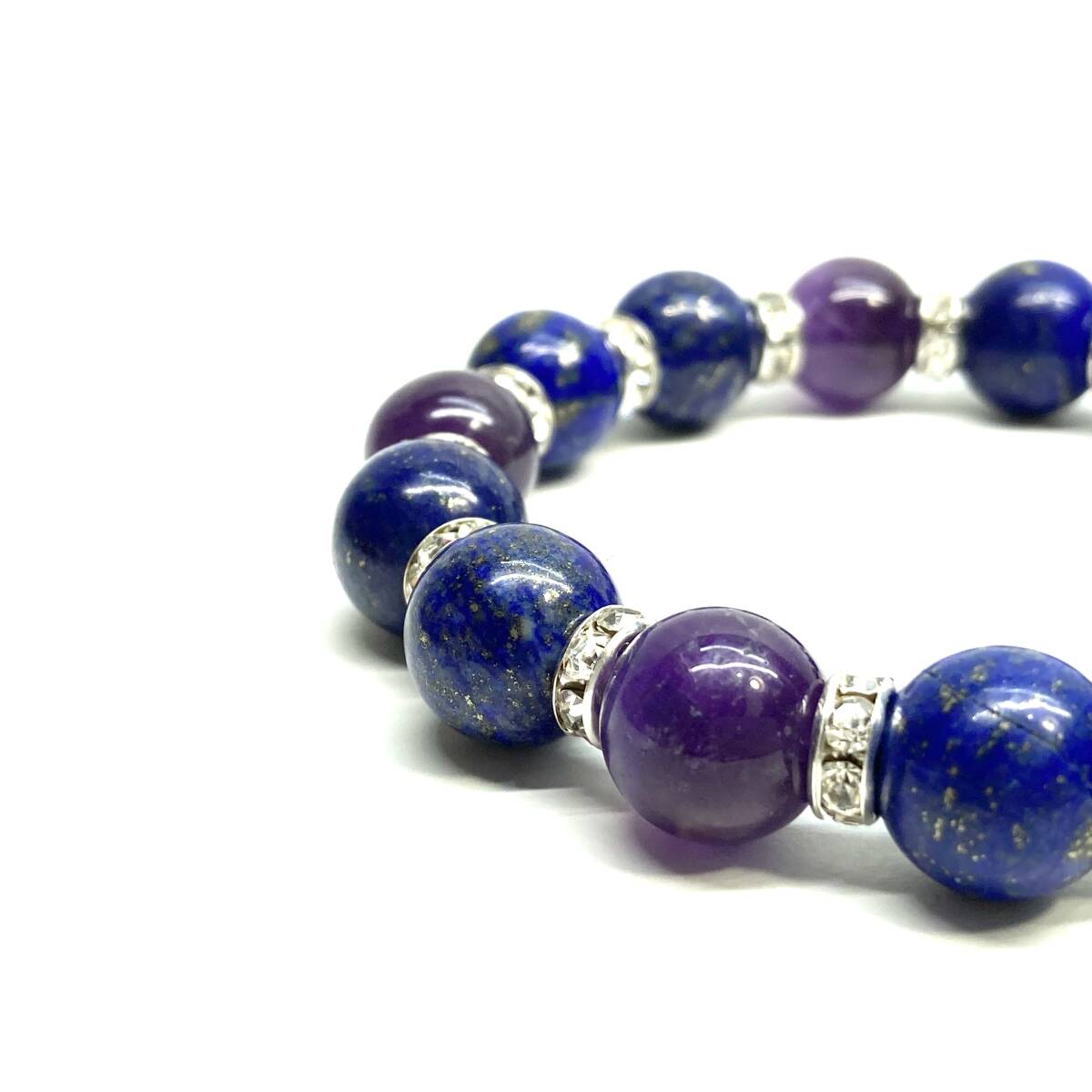 こちらは、ラピスラズリとアメジストを組み合わせたパワーストーンブレスレットです。間にはロンデルを挟み高級感あるデザインに仕上げております。程よくインパクトがある12mm玉を使用して内周約18cmです。(サイズ変更の場合は取引ナビにてご連絡をお願いします。) 数に限りがございますので気になる方はお早めにどうぞ。