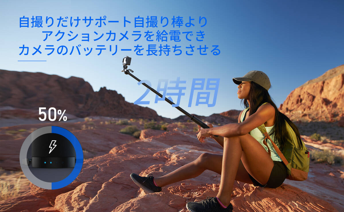 アクションカメラ用充電式自撮り棒 2600mAh モバイルパワー 6段伸縮 折りたたみ アルミニウム製自撮り棒 持ち運びに便利