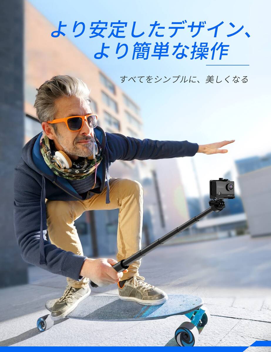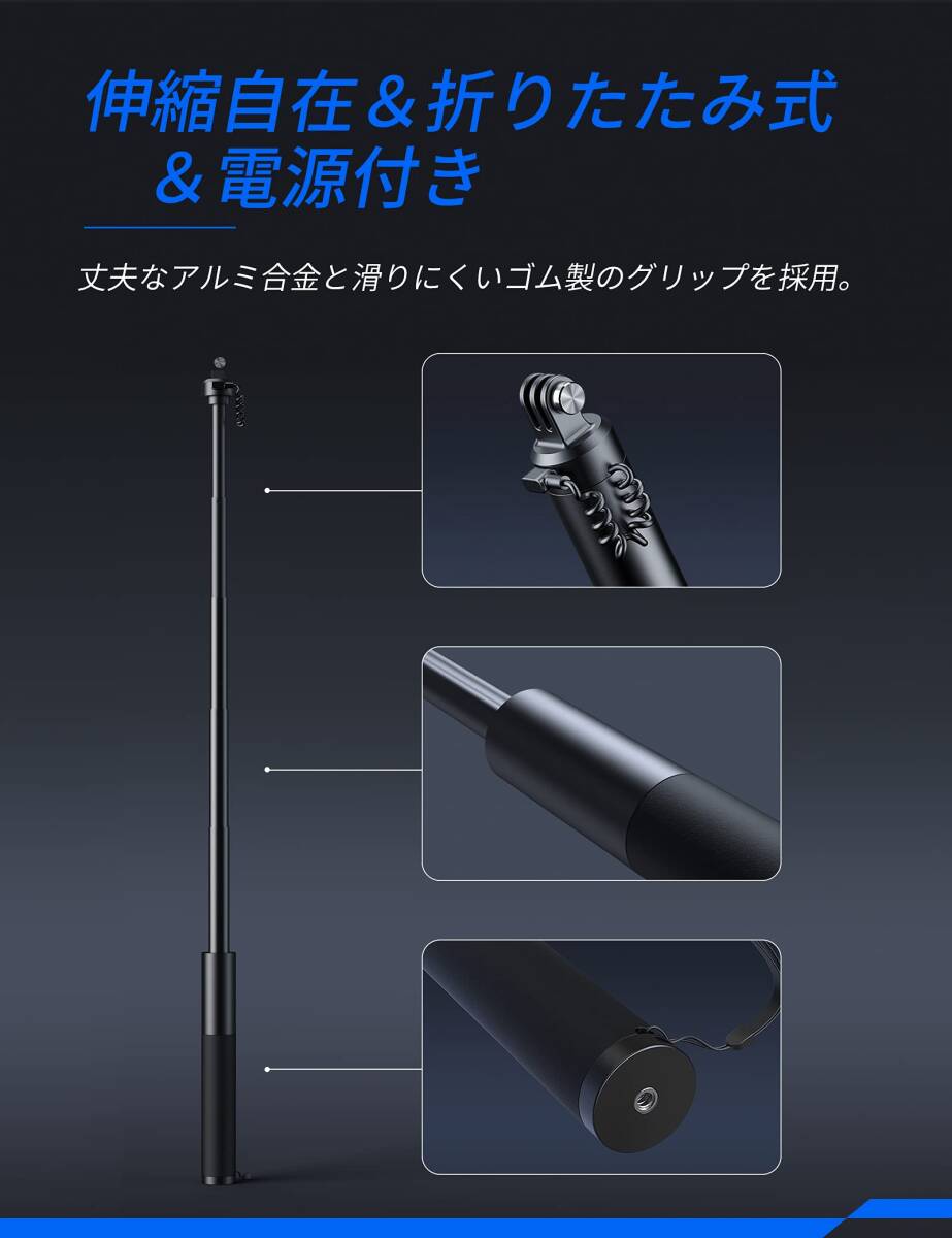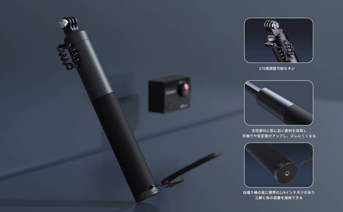 • 【高品質素材】このアクションカメラ自撮り棒は高品質アルミニウム合金素材を使用し、特殊な加工を施して、軽量化と耐久性を実現し、ハンドルには滑り止めシリコンが追加されており、快適で滑りにくく、手触りが良いです。