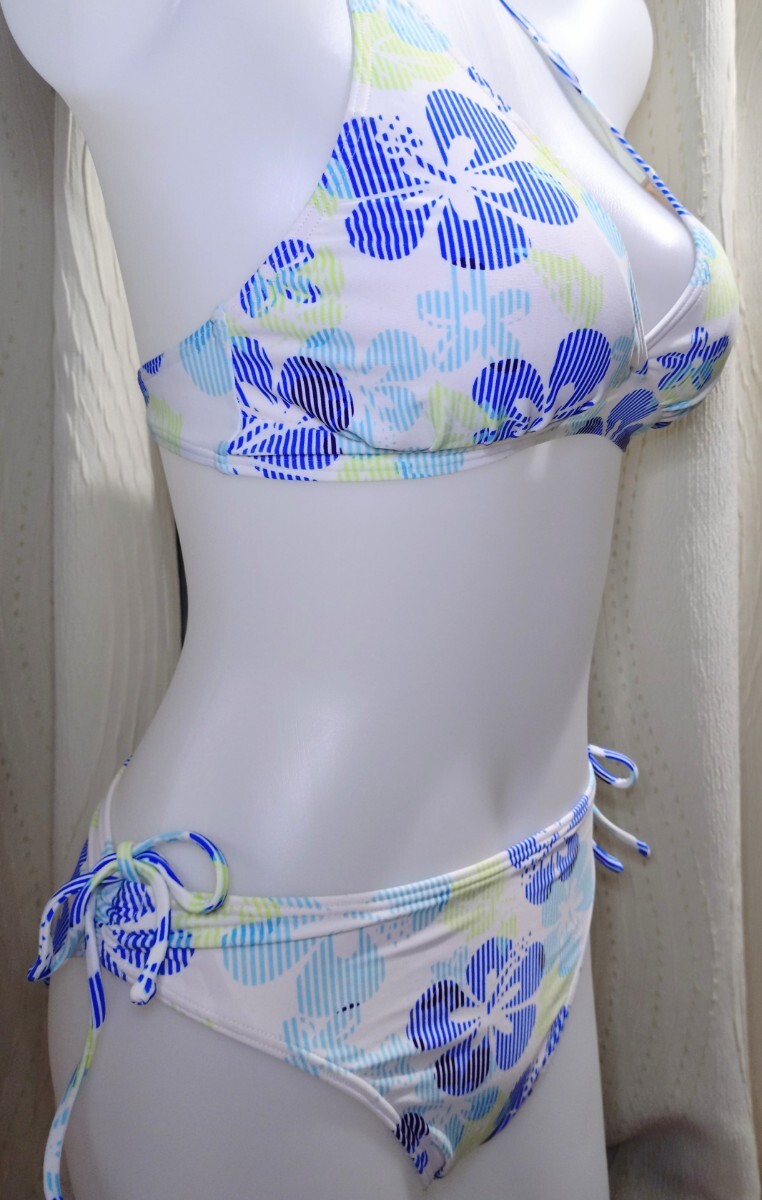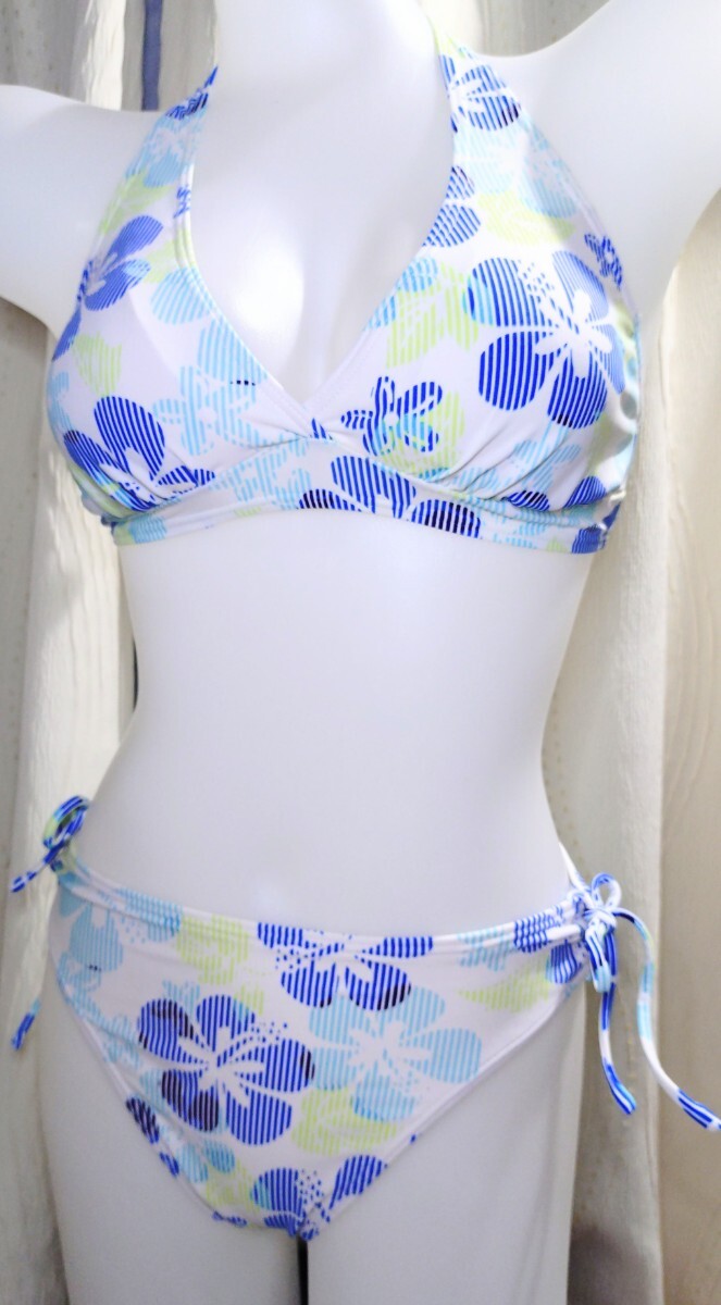 中古★レディース ビキニ Mサイズ 白系 ハイビスカス 青 水着 ホームクリーニング済み セパレート 匿名配送 同梱可