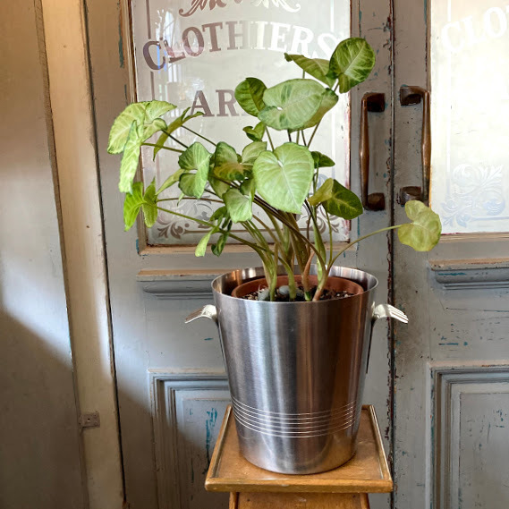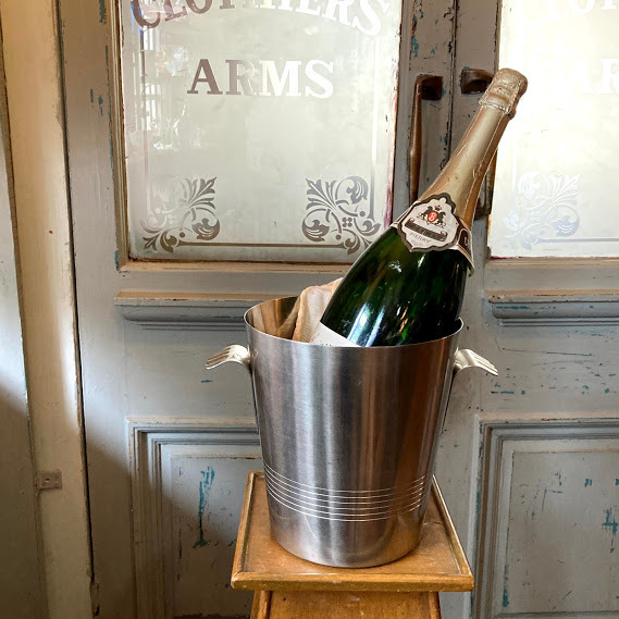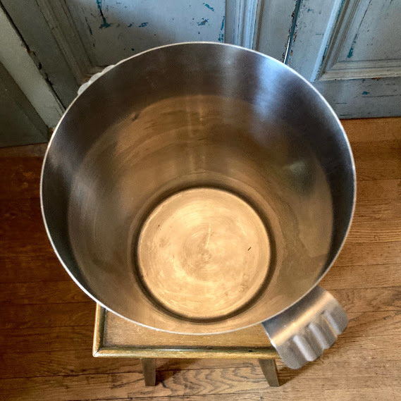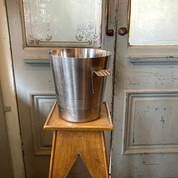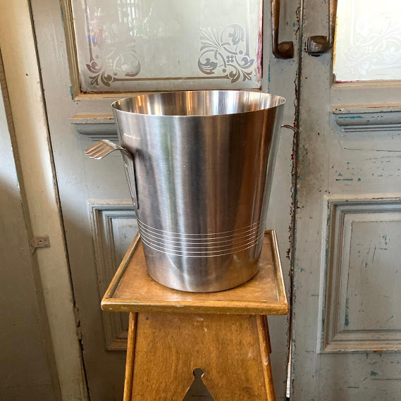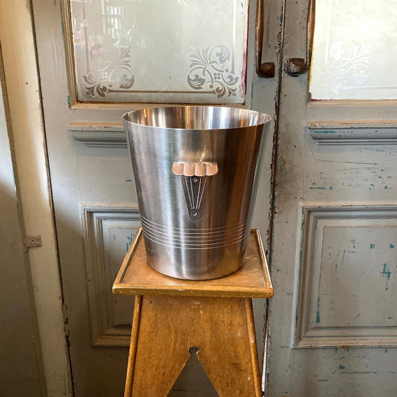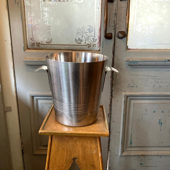イギリスで買い付けました。フランス製 1970年代Letang remyのシャンパンバケツです。まるで小さな手を広げたような可愛らしい持ち手とステンレススチールのシンプルなデザインはどの場所にも馴染みそうですね。シャンパンやワインクーラーとしてもご利用いただけますが、お酒を飲まない方は観葉植物との相性も◎なので鉢カバーなどにもおすすめですよ。ビンテージキャンプに使ったり、贅沢な使い方としてはゴミ箱としてもちょうどいいサイズ感です。大きな凹みなどはございませんが、古いお品のため底面に経年劣化による小さな擦り傷があります。古いものが好き、時代を感じる雰囲気が好き、ジャンクなものも好き!という方におすすめです。新品のクオリティを求められる方はご遠慮ください。福岡市南区の店舗にてお渡しもできますのでお気軽にどうぞ!