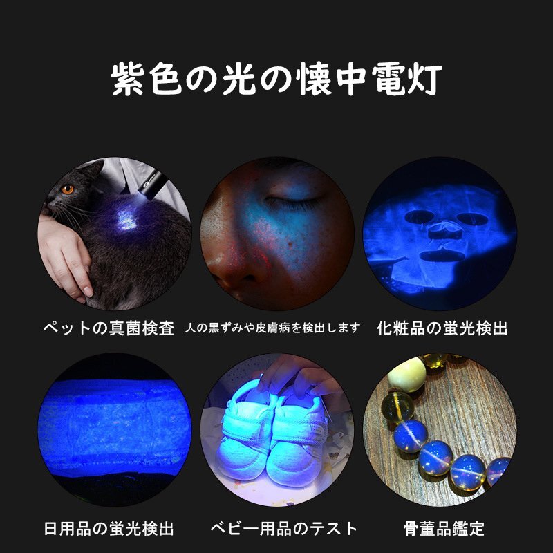 UVライトは、一般的な蛍光物質を光らせることができる:猫の尿、床や草の汚れや液体を強調表示する;猫の白癬菌、偽造文書を検出する;紙幣、運転免許証、公的IDカード、パスポートを検証する;ACリーク検出に染料を使用する;暗闇で光る化粧品、目に見えないインク、サソリ、ウラン/放射性ガラスを活性化する;また、琥珀や宝石の検出、3D印刷樹脂の硬化、植物ミミズの露出にも優れています。