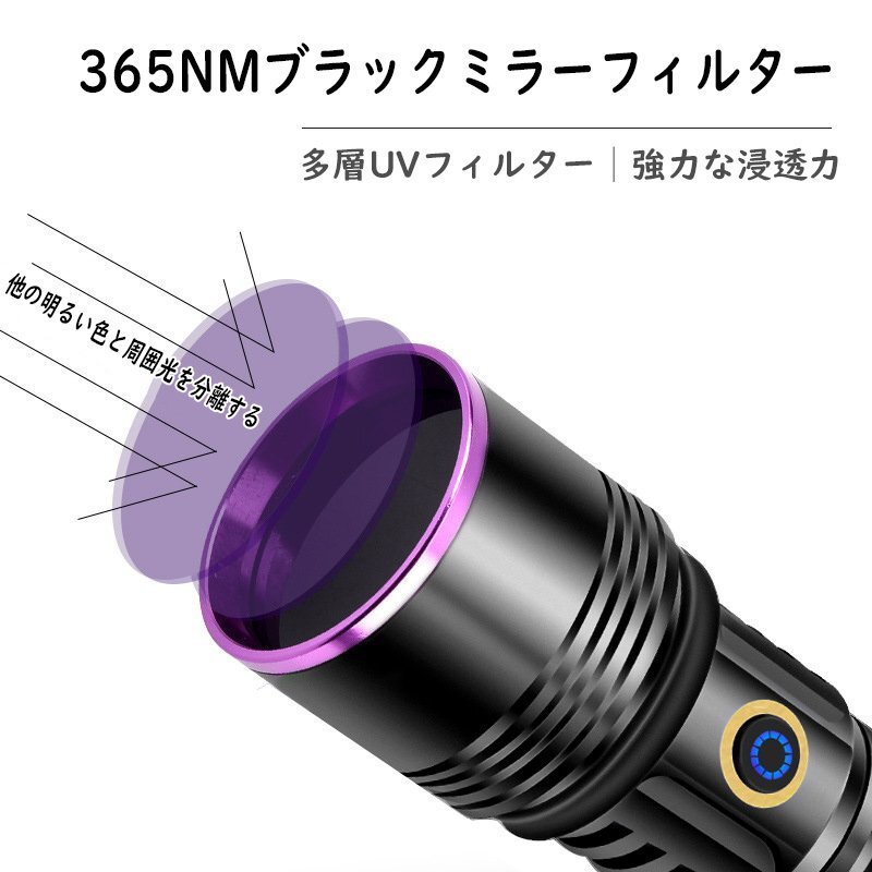 ※レンズは365NMブラックミラーフィルターと多層UVフィルターを採用しており、強い透過力があり、周囲の光を他の明るい色から分離できます。