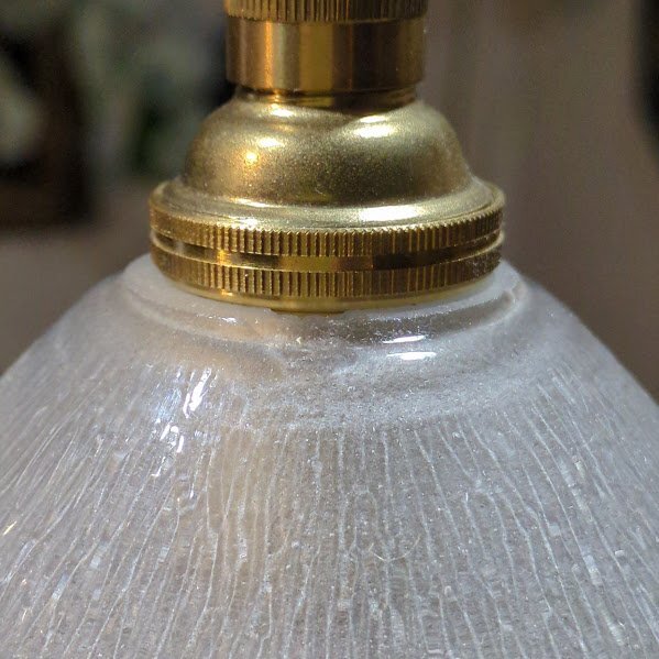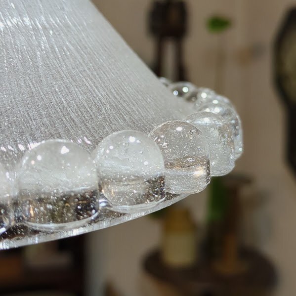 無数の気泡をまとった姿は宝石のように輝き、心をときめかせるたたずまいです。同じデザインのものがありますのでペアで使ってもいいですね!外側はつるんとした質感で、内側はマットになっています。口金部分に約5mmほどの小さなカケがありますが、下からは見えませんのでご安心ください。年代不詳