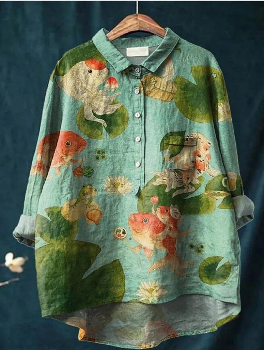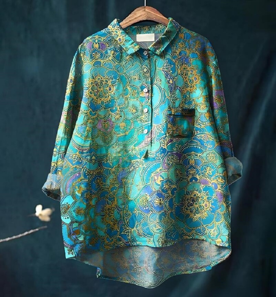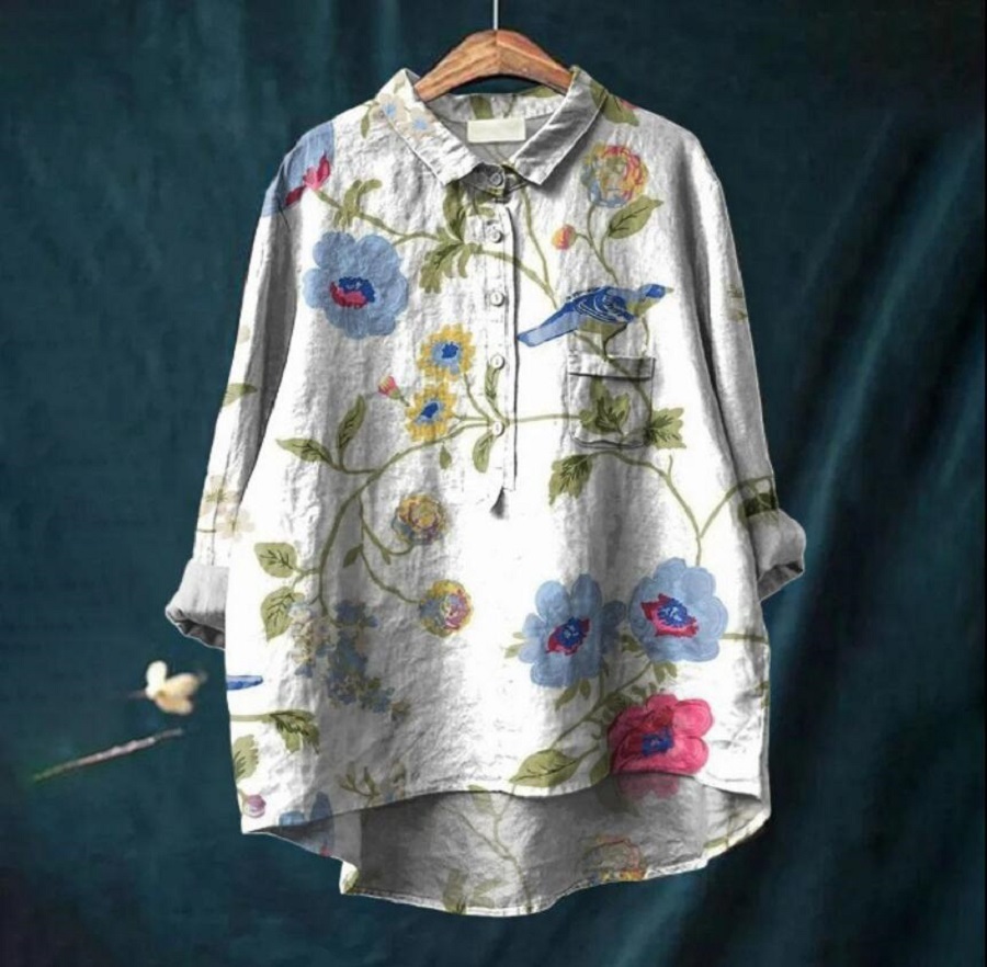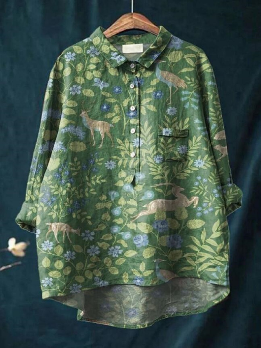 同梱1万円送料無料■シャツ ブラウス 着痩せ チュニックシャツ 綿麻 プリント柄 トップス レディース 長 袖 体型カバー チュニック