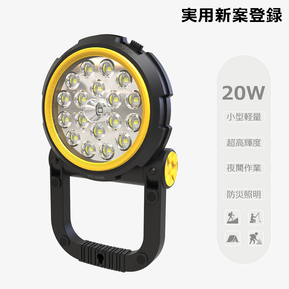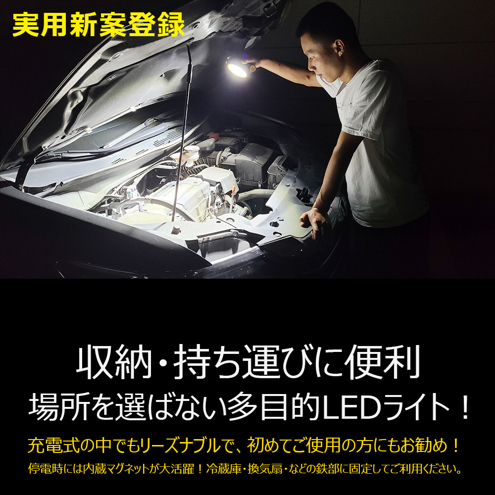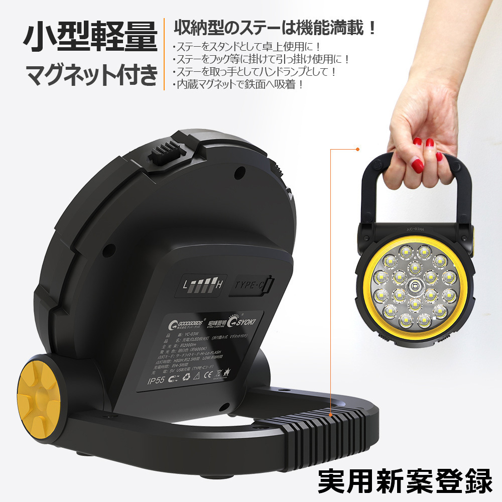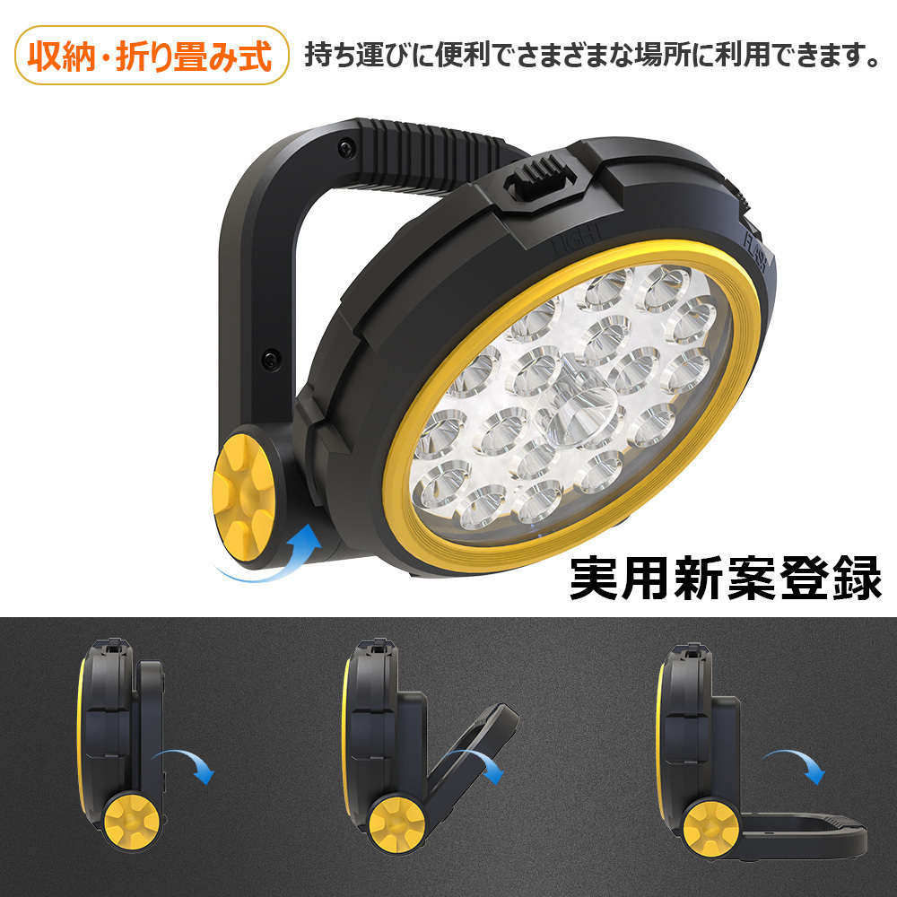 | ★オススメポイント★ 折り畳み式・マグネット付きの20w 充電式LED作業灯登場!折り畳み式・充電式で、コンパクト・軽量・経済的 機能:4モード点灯、折り畳み可能、マグネット付き、スマホに充電対応、バッテリー残量表示灯付き ●折り畳み式:コンパクト・小型なデザインで持ち運びに非常に便利です ・コンパクト:小型なデザインで重さが0.32Kg、カバンに入れても軽量なため安心。 ・小型且つ軽量化タイプなので、持ち運びに非常に便利です。 LED作業灯、ランタンと懐中電灯の機能を持ちます ●20W COBタイプLEDを実装して、直視できない程の眩しい光を照射。 LED COBチップが設置され、均一なひとつの面で発光するため、直視できない程の眩しい光を照射。 120°の広角照射と相まって、より幅広い範囲を真昼の如く照明できます。 ●ワンタッチで点灯4モード切替可能! ハイ・ロー・サーチライト・FLASH4モードを搭載! ハイ・ローモード:使う場所や時間帯によって用途に合った使い方ができる。 サーチライト・FLASH:イザというときに役に立つ! 稼働時間:ハイ/2.5時間、ロー/8時間 ●強力マグネット付きで様々なシーンで活躍すること間違いなし! マグネットが付いており、鉄などの金属に吸い付けます。引っ掛けて使用する事もできます。 作業するとき、両手が解放され、作業も快適なワークに楽! 前後210度の方向が調節することができます。照明の方向が調整することができます、仕事のときには働きやすいです。 ●耐衝撃、耐振動、丈夫な設計で安全、安定性、信頼性の高い! 2Mからの落下にも耐える丈夫な構造で手の不注意で商品を落とす不安不要! ●設計にヒューマナイズ!バッテリー残量表示灯&充電表示灯を搭載! 電量残量表示灯と充電量指示灯を組み込んだ設計です。表示は25%、50%、75%、100%の4段階です。 電池電力表示ライトも付き、電力が少なくなることがすぐに分かるため予め充電準備可能。 ●モバイルバッテリー機能:スマホや携帯などに充電対応できる USBコネクターを連続して、USB給電可能なiPhone、iPad、スマホ、Tablet、WiFiルータ、ゲーム機等の充電が可能。 ※USBで利用して充電できるなら全部OKです。 用途 整備工場・板金塗装工場・アウトドアなど・電源の無いところ大便利! 作業用:倉庫作業、自動車整備、ガレージ、物置、電設工事(天井裏工事)、リフォーム建築などの照明として。 アウトドア用:キャンプ、バーベキュー、登山、夜釣り、ペットの夜間散歩などの照明として。 常備用:停電対策、災害の備えに。 |