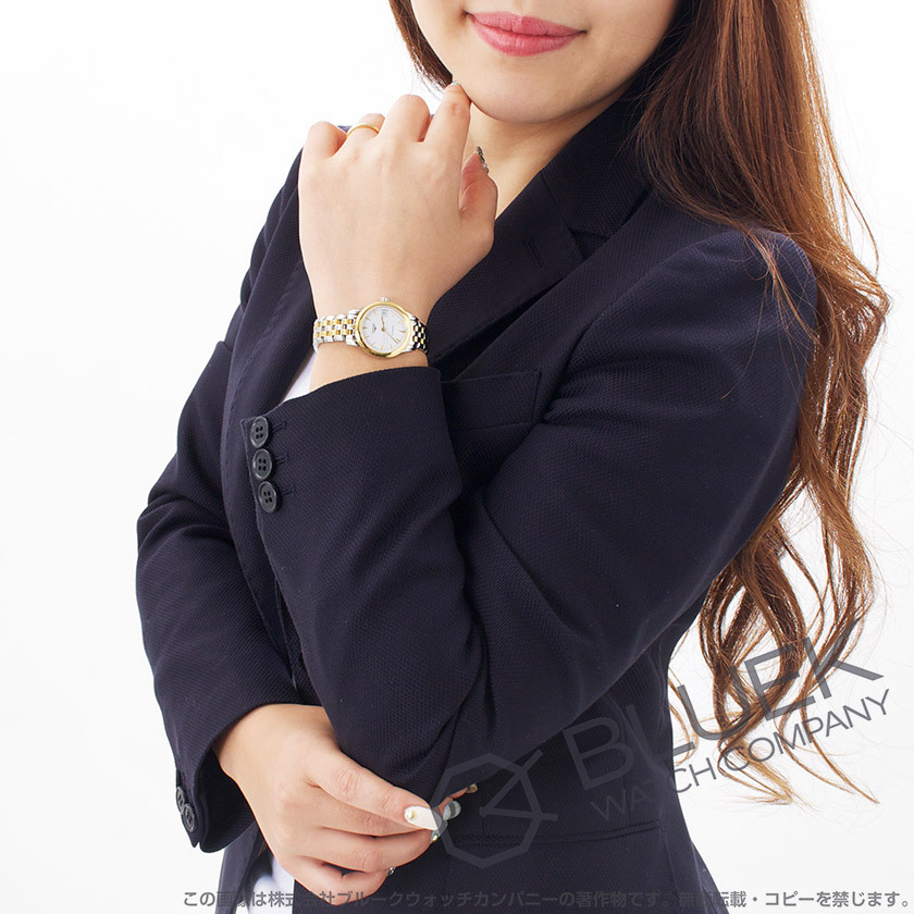 | スイスの老舗ロンジンの顔としてエレガントな気品をまとわせるフラッグシップ。ステップベゼルを備えた厚さ8ミリ薄型ケースと着け心地しなやかな5連ブレスが装着感に優れ、透明な裏蓋から精緻な自動巻きムーブメントが鑑賞できるのも魅力です。中でも小ぶりで女性らしいこの26ミリモデルは、シルバー×ゴールドの光沢コンビネーション華やかなデザインにホワイトダイヤルを合わせたデザインが爽やかでお洒落。3時位置に日付窓を設けたダイヤルは指針&くさびのゴールドがホワイトに映えて美しく、オンオフ問わず活躍して洗練された装いを完成させます。 |