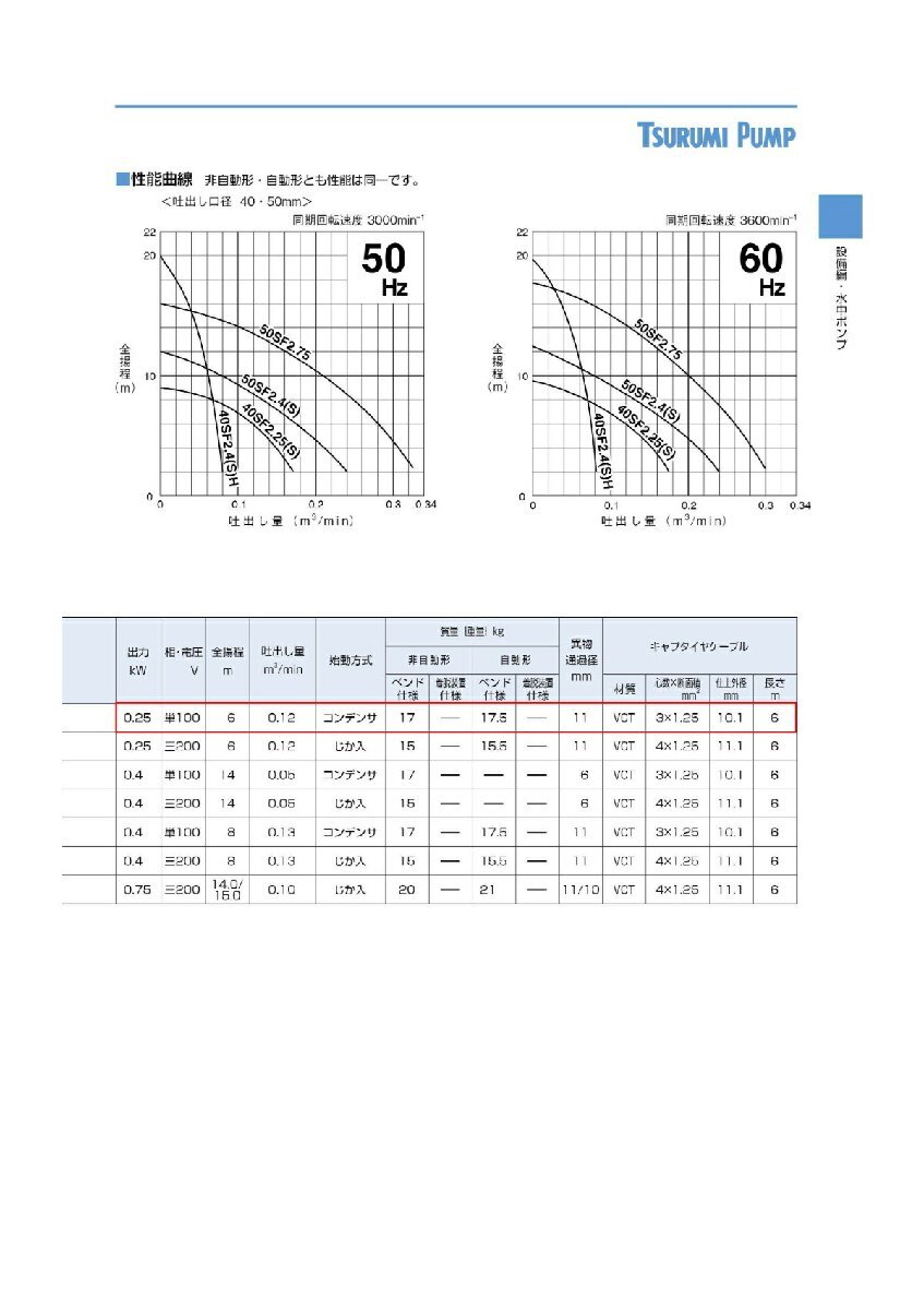 〈ツルミ〉40SFA2.25S 汚水用 水中うず巻ポンプ SF型 自動型 口径40mm 60Hz 西日本用 単相100V 出力0.25kW ツルミポンプ