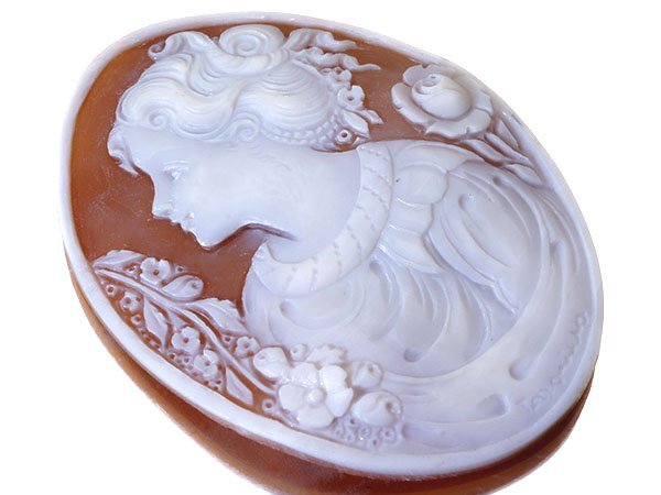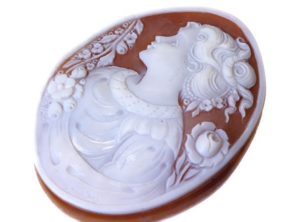 綺麗な貴婦人を繊細に彫刻で演出した、素晴らしい高級シェルカメオルースです!