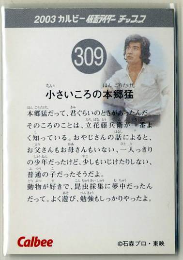 | ◆防水対策 厚紙補強 カルビー 仮面ライダーチップスカード(2003 復刻版) 309番 小さいころの本郷猛 トレカ 即決 | |