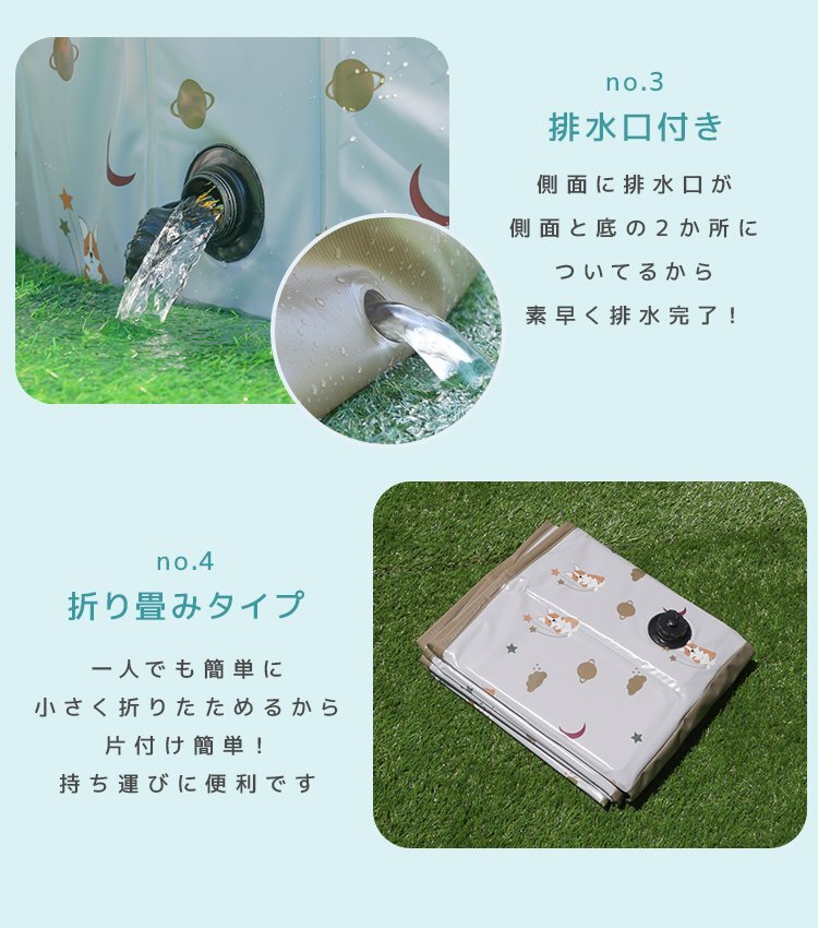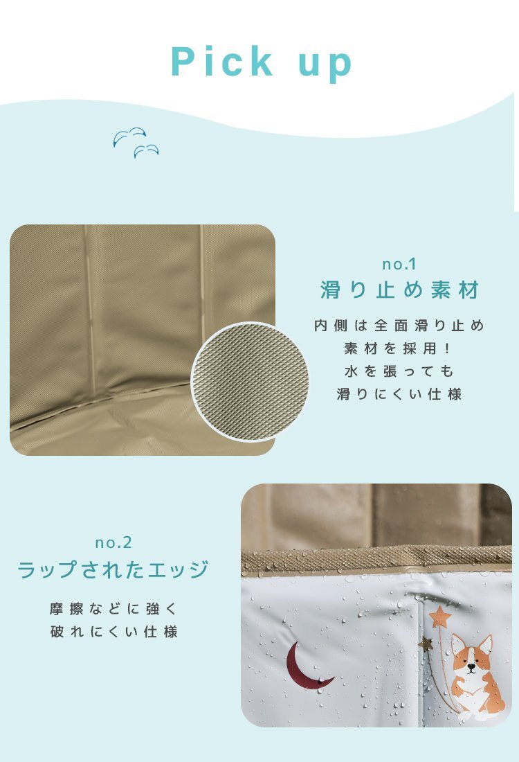 簡単設置、簡単片付けでマルチに使える折りたたみプール! 面倒な空気入れ作業がないので、パタパタ開いて水を入れたらすぐに遊べます。 ペットの水遊びやお風呂としての使用の他、子供用のプールや砂場、室内ではボール遊びにもオススメ! 使い終わったら畳んでコンパクトに収納できます。 【商品仕様】 カラー:コーギーブラウン サイズ:(約)160cm×160cm×30cm 重量:(約)4.7kg 素材:ポリ塩化ビニール(PVC) 対象年齢:4歳以上 ※使い始めは、素材特有の匂いがする場合があります。一日程度、風通しの良い場所に広げておくと解消されます。 ※製造過程の為、多少の折り目、製造時の汚れ、シミ、シワ、色落ち、若干の接着剤残りなどある場合がございますが不良ではありません。 これらを理由とする不良返品、不良交換はお受け致しかねます。 ※必ず保護者同伴のもと、本商品をご利用下さい。また対象年齢未満のお子様は使用しないで下さい。 ※プールを置く付近に破損の原因となるトゲやガラス片、金属片、木片、砂利などがないかご確認下さい。 ※プールは安定した平らな場所でご使用下さい。傾斜のある場所、タイル・煉瓦など目地や段差のある場所でのご使用は変形・破損の原因になりますので避けて下さい。 また表面に塗装・コーティング等の処理された場所でのご使用は塗装等が変色したりプール本体に色移りすることがあります。 ※商品は、モニターによって色合いが異なって見える場合があります。 ※仕様・デザインは改良のため予告なく変更することがあります。 |