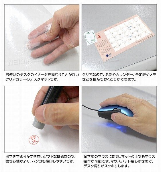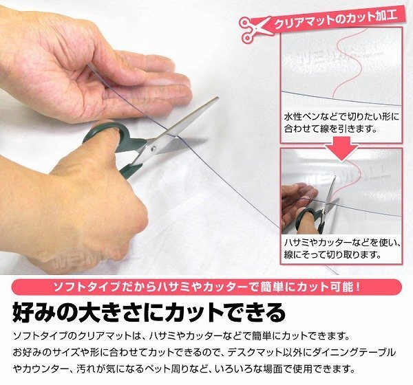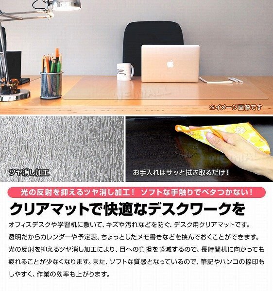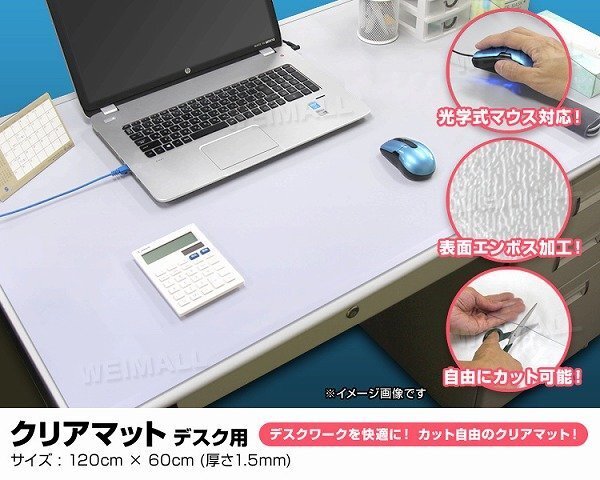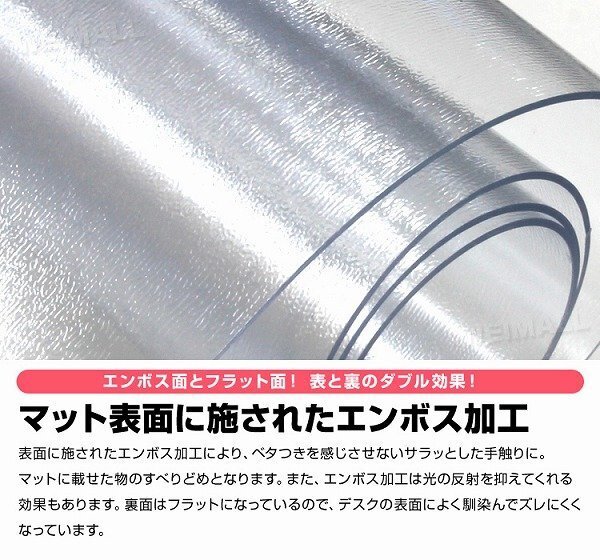 | カレンダーや予定表、メモなど挟めるクリアタイプのデスクマットです。 光学式マウスにも対応しているので、マウスパッドを使用せずにマウス操作ができます。 デスクマット表面にエンボス処理を施すことで、ベタつきを感じさせないサラっとした表面になっています。 また、このエンボス処理は光の反射を抑えてくれる効果も◎! ハサミで簡単にカットができるので、デスクマット以外にも、様々なシーンで使用できます! 【商品仕様】 カラー:クリア サイズ(約):幅120cm×奥行60cm(厚さ1.5mm) 材質:軟質PVC 使用温度(約):−20℃〜50℃ ※お手入れは薄めた中性洗剤を湿らした布につけ、固く絞って拭いた後、水分が残らないように乾いた布で乾拭きしてください。 ※日の当たる所で使用しないでください。日焼けで硬化する場合があります。 (デスクマット 透明 クリアデスクマット PVC製 ソフトタイプ 保護シート 机 学習机 学習机マット パソコンデスク クリアマット 透明マット テーブル クリア マット デスクシート クリアーデスクマット テーブルマット 光学マウス対応) |