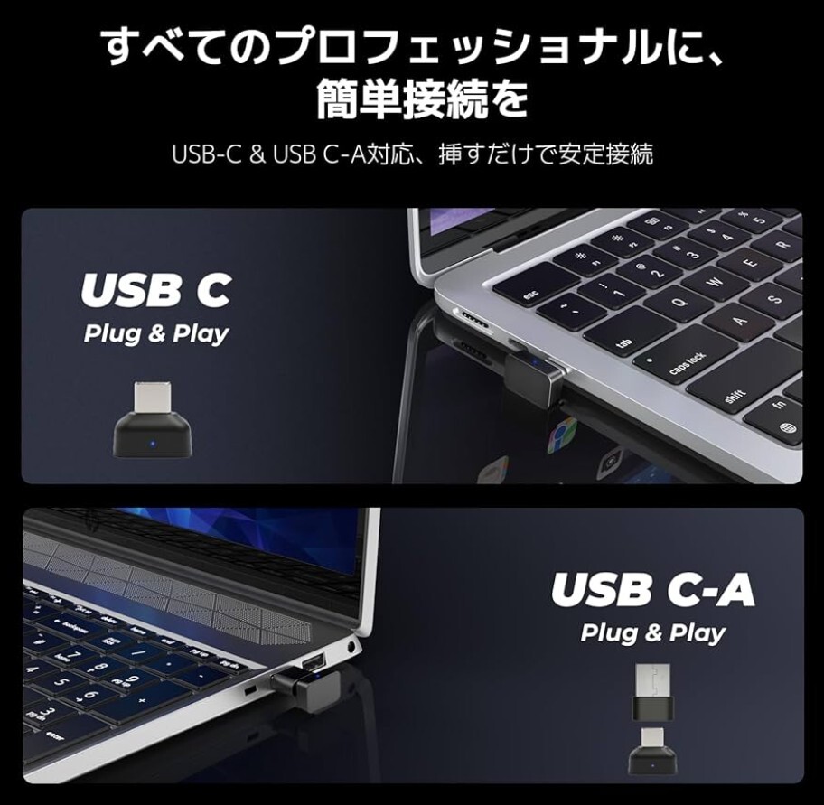 USB-CドングルとUSB-Aアダプターを標準装備。PCでは挿すだけで即接続でき、Bluetoothペアリングの手間がありません。スマートフォンやタブレットではBluetooth接続に対応し、どんなデバイスでも快適に使えます。