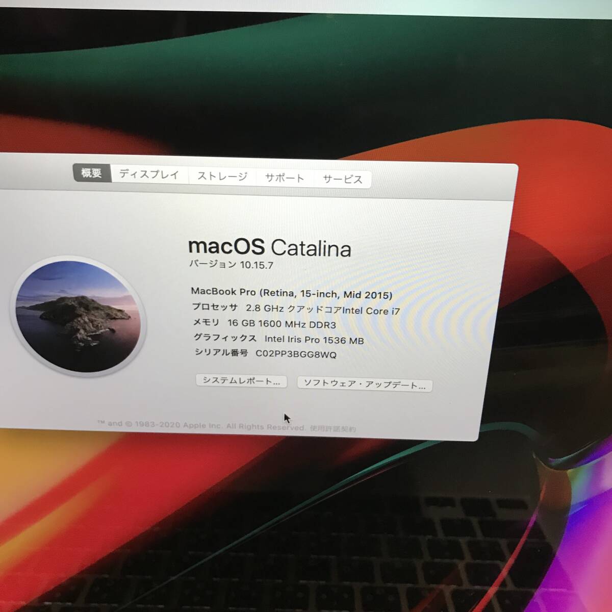 | これは美しいMacBook Pro 15インチ Retinaモデル(2015年、i7 CPU搭載)です。電源チェック:問題なし、ディスプレイチェック:問題なし、通常動作チェック:問題なし。その他は未チェックです。ご購入前に画像をご確認ください。クレーム・返品はご遠慮ください。 | ||||||||||||||||||||||