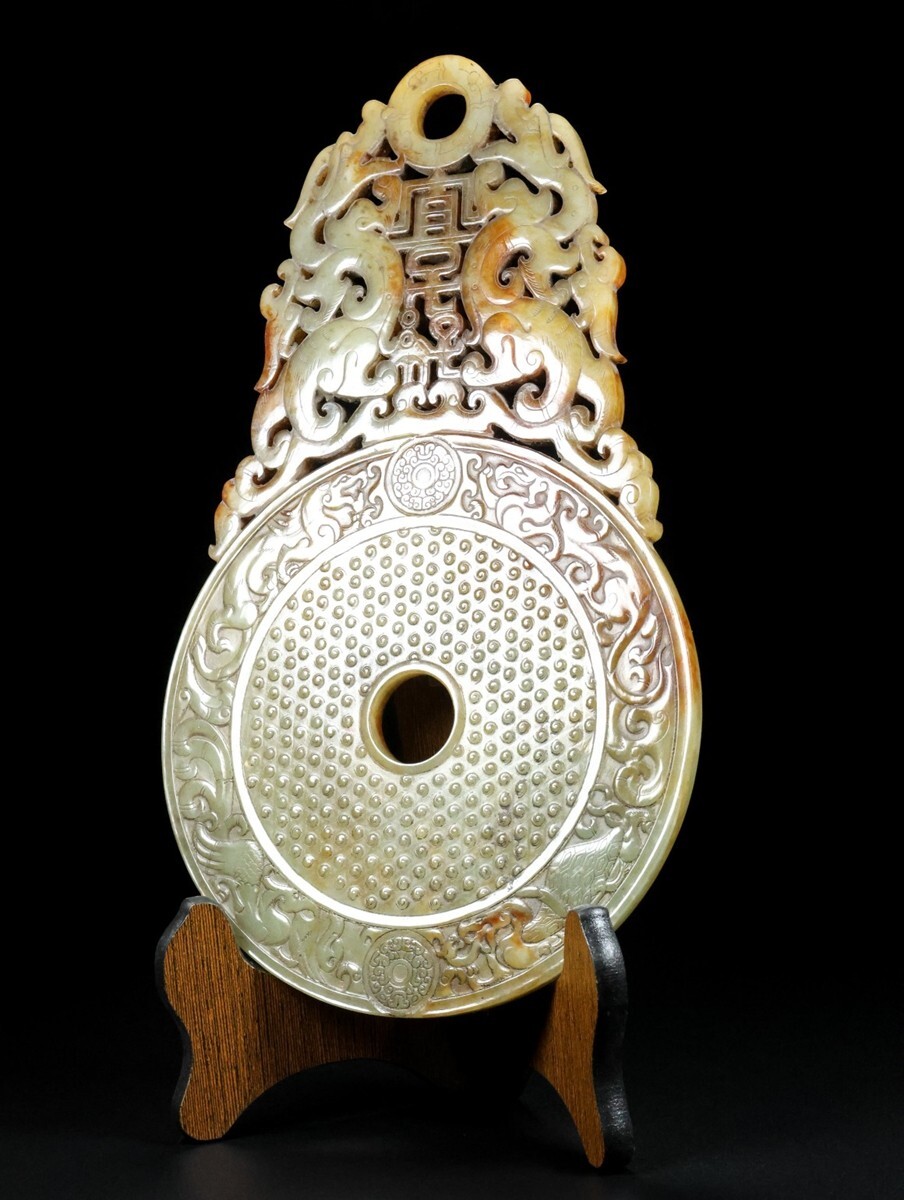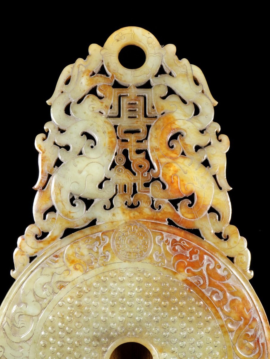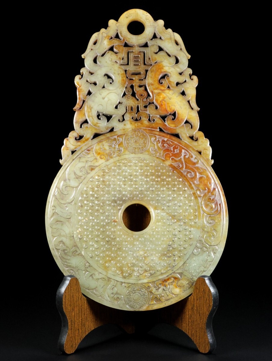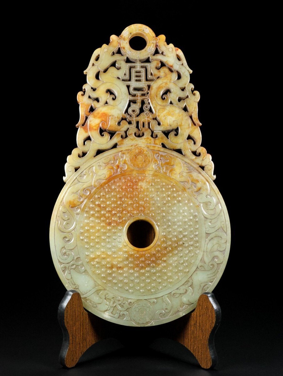「時代物 和田玉 高古玉彫り 宜子孫 靠山璧」極細工 擺件 中国古賞物 古美術 旧蔵出