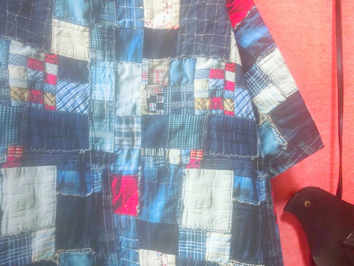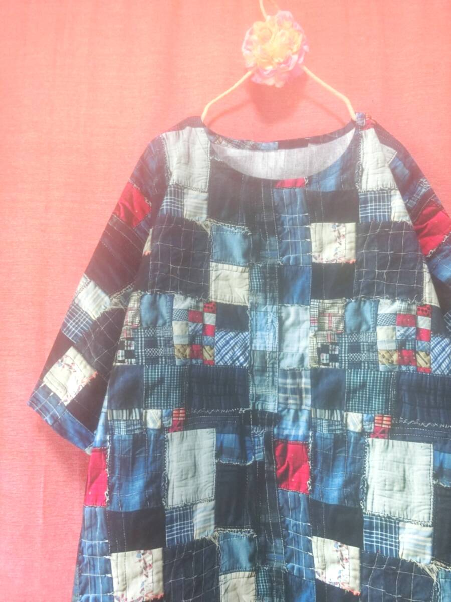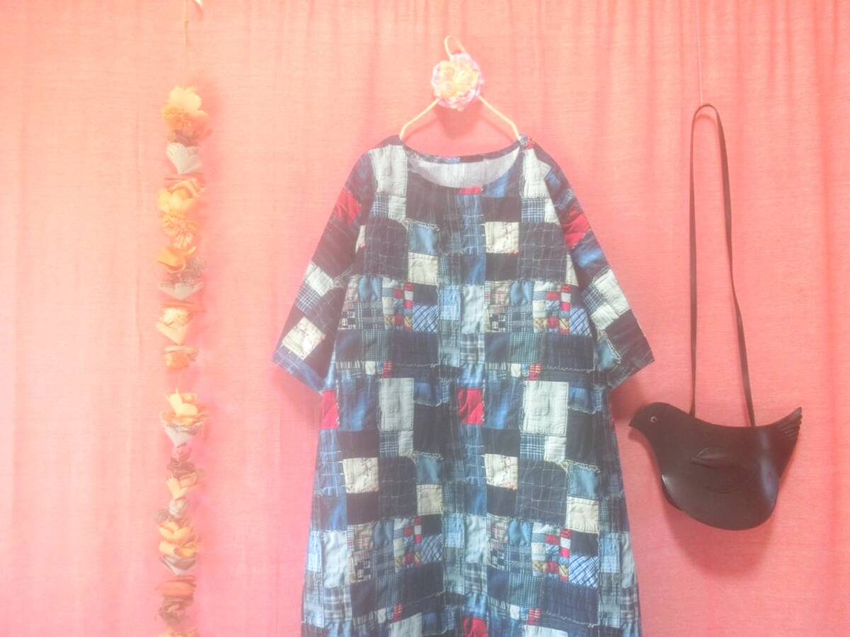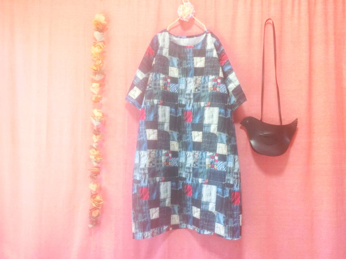パッチワーク風のプリントが斬新なゆったりワンピースです。