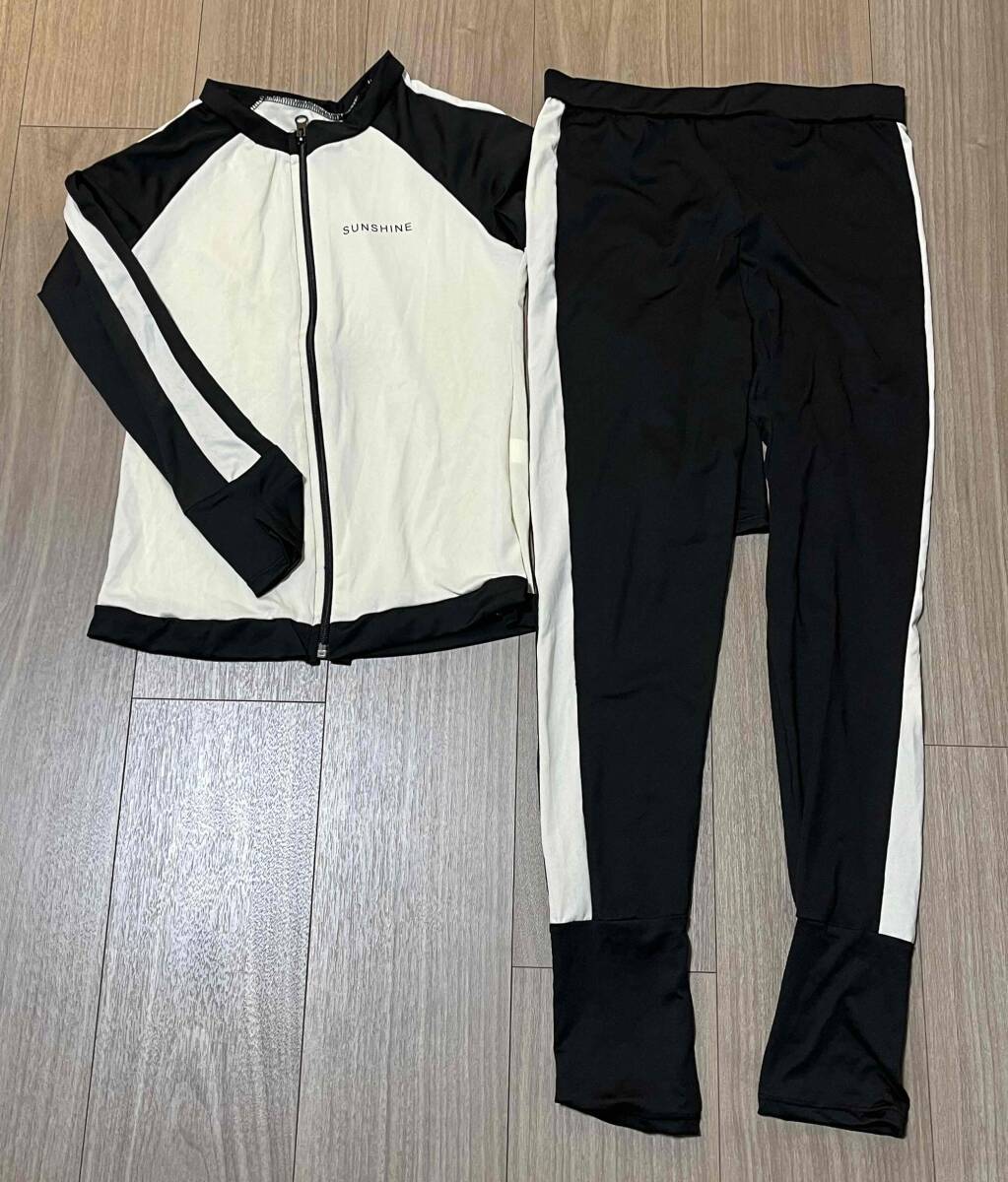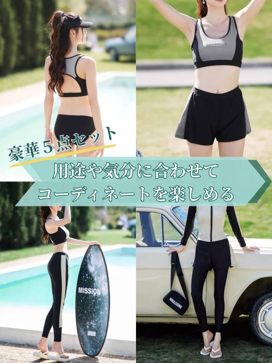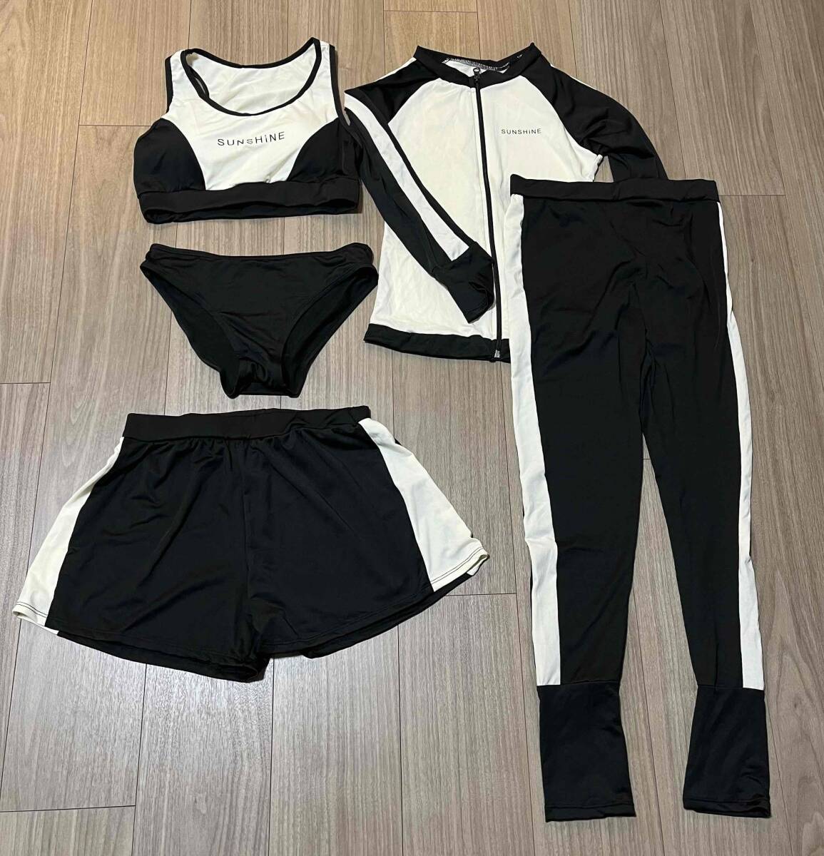 ラッシュガード、ショートパンツ、レギンス、ブラ、ショーツの5点セット。