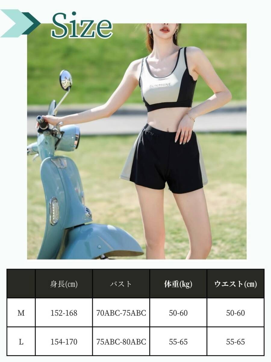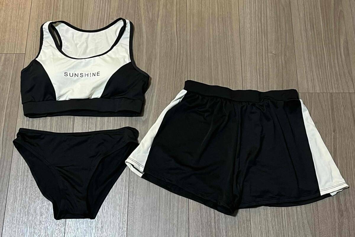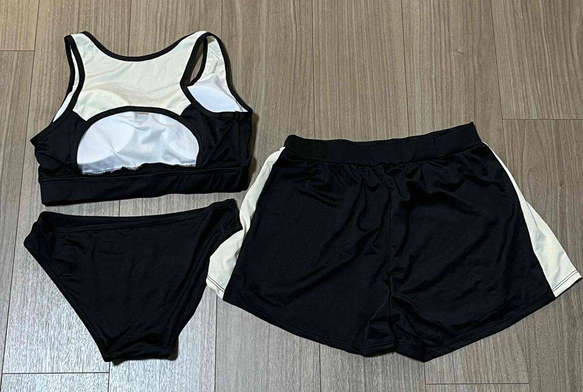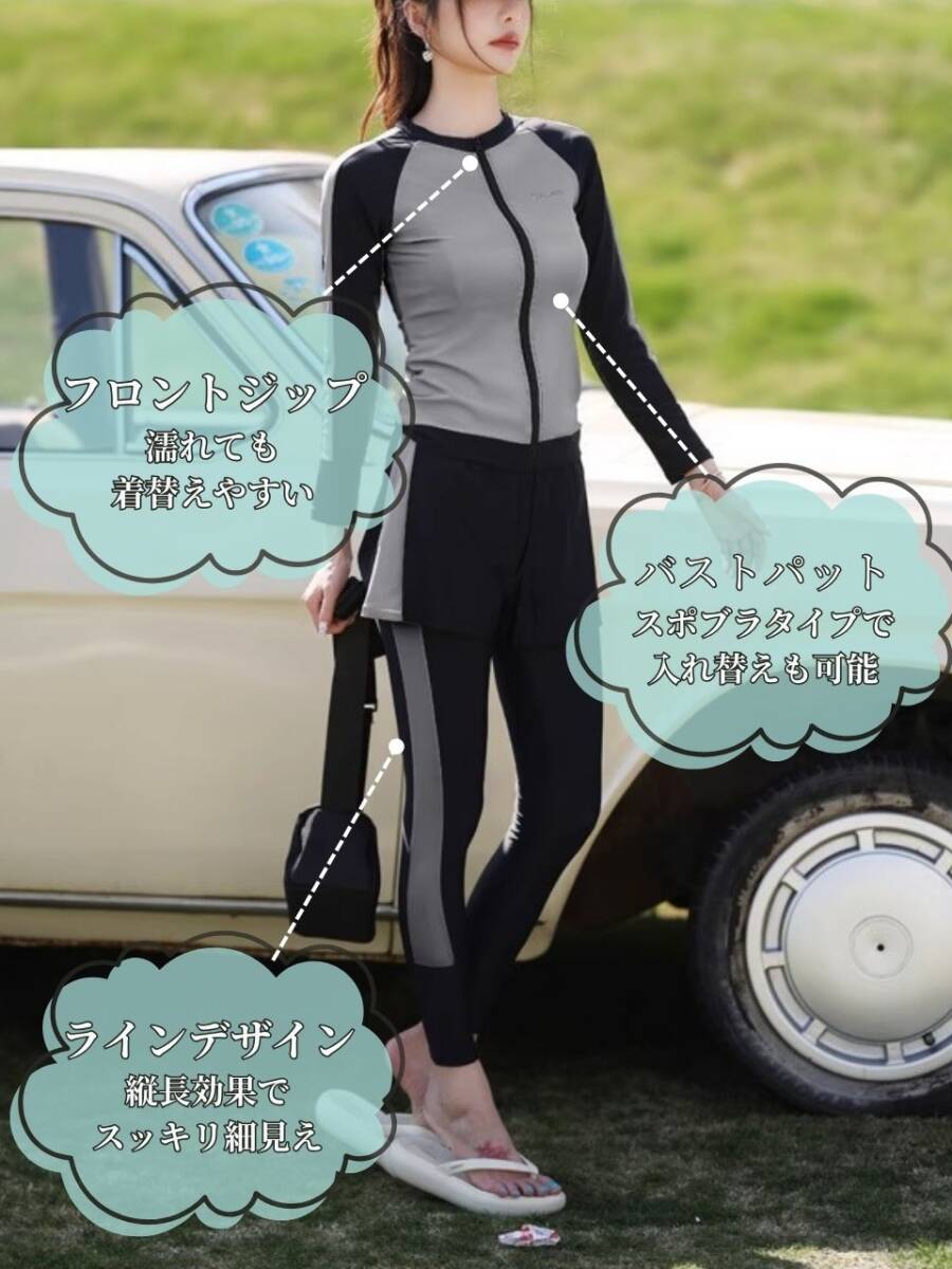 ラッシュガードは細身のシルエットを意識したデザインで、ツートンカラーによって落ち着いた印象を与える仕様です。フロントファスナー付きで着脱がしやすい構造となっています。ショートパンツとレギンスの組み合わせにより腰まわりや太ももを覆うことができ、体型カバーにも配慮されています。