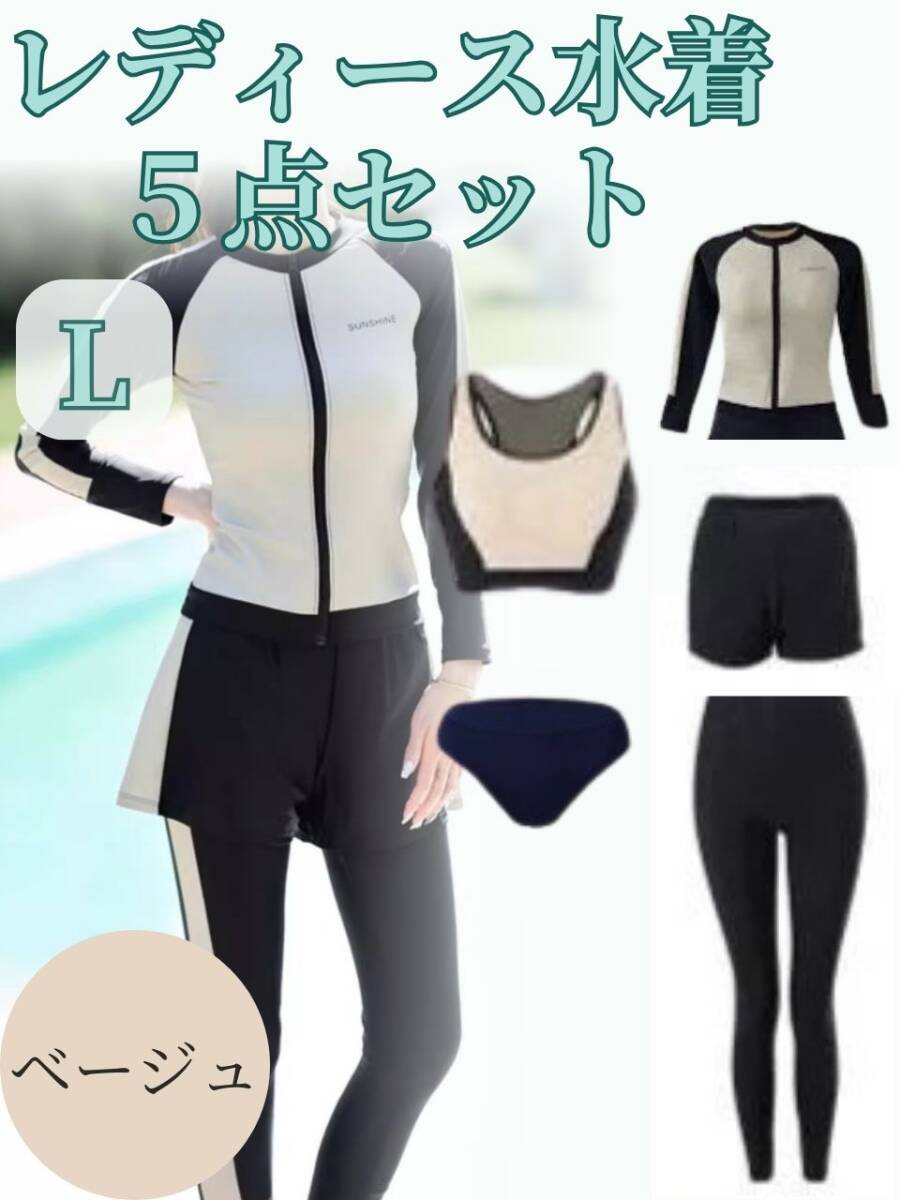 見切り品 【訳あり】 ラッシュガード 水着 5点セット Lサイズ ベージュ 体型カバー 日焼け対策 フィットネス レギンス 長袖
