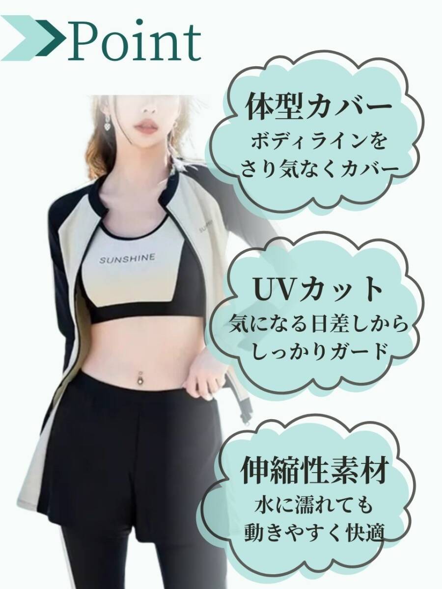 UVカット機能付きの生地を使用しており、首元から足首までを覆うことで紫外線からの影響を軽減します。日焼け防止に加えて、虫刺されやクラゲとの接触、擦り傷といった外的要因による肌へのダメージの予防にも配慮された設計です。また、岩場などでの接触によるケガのリスクを軽減する目的でも着用が推奨されます。