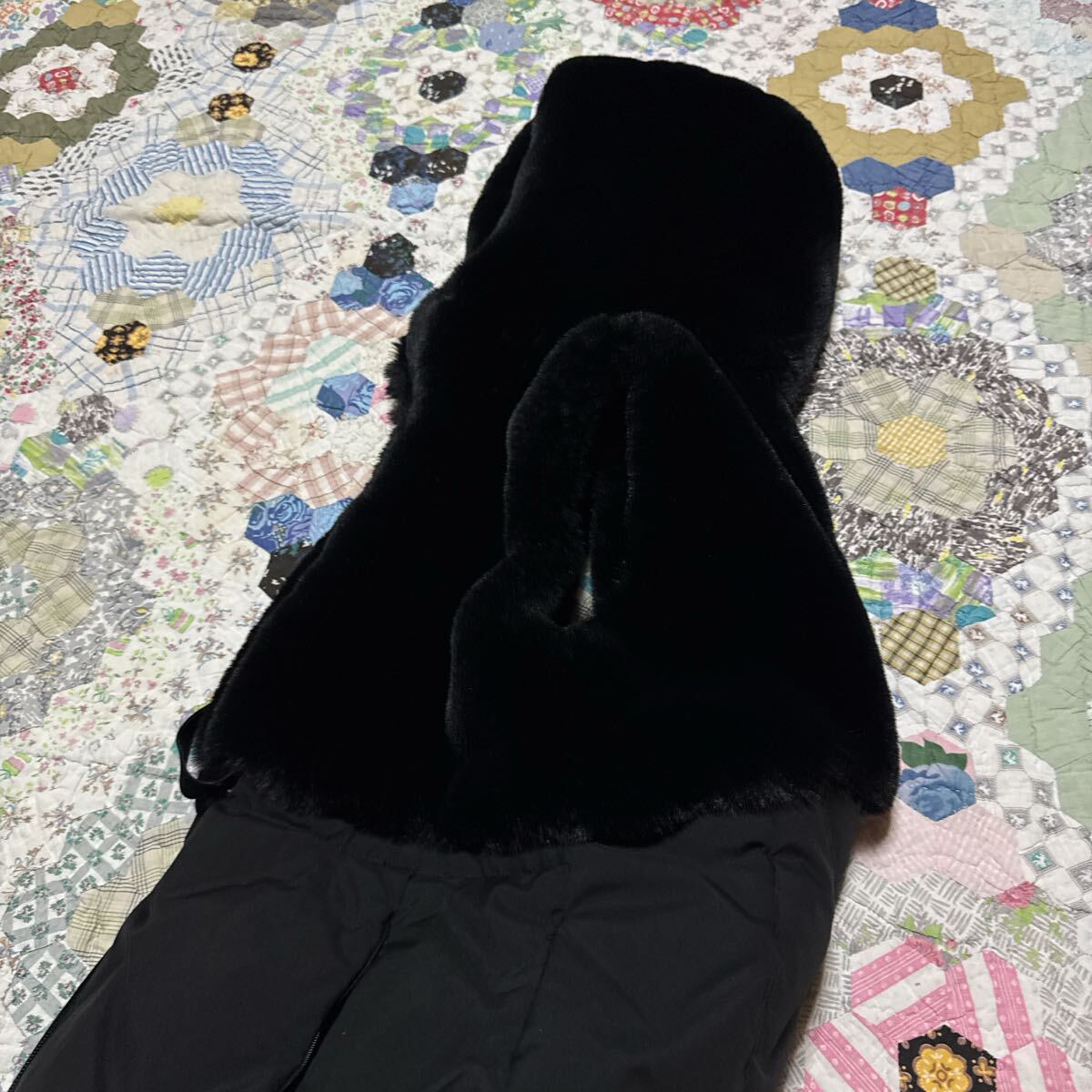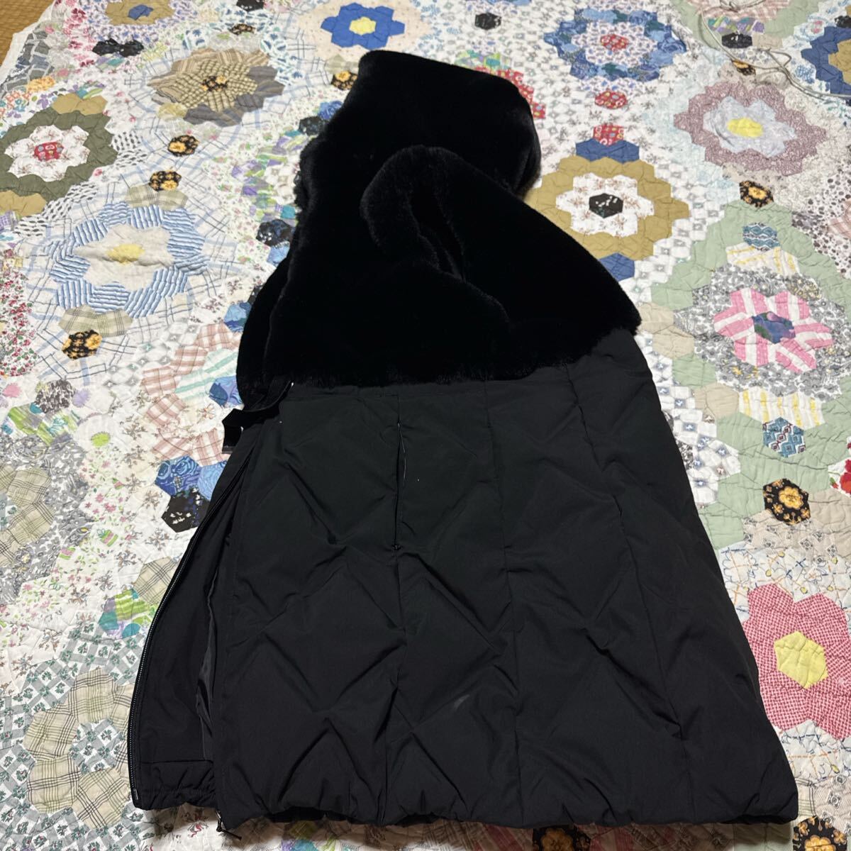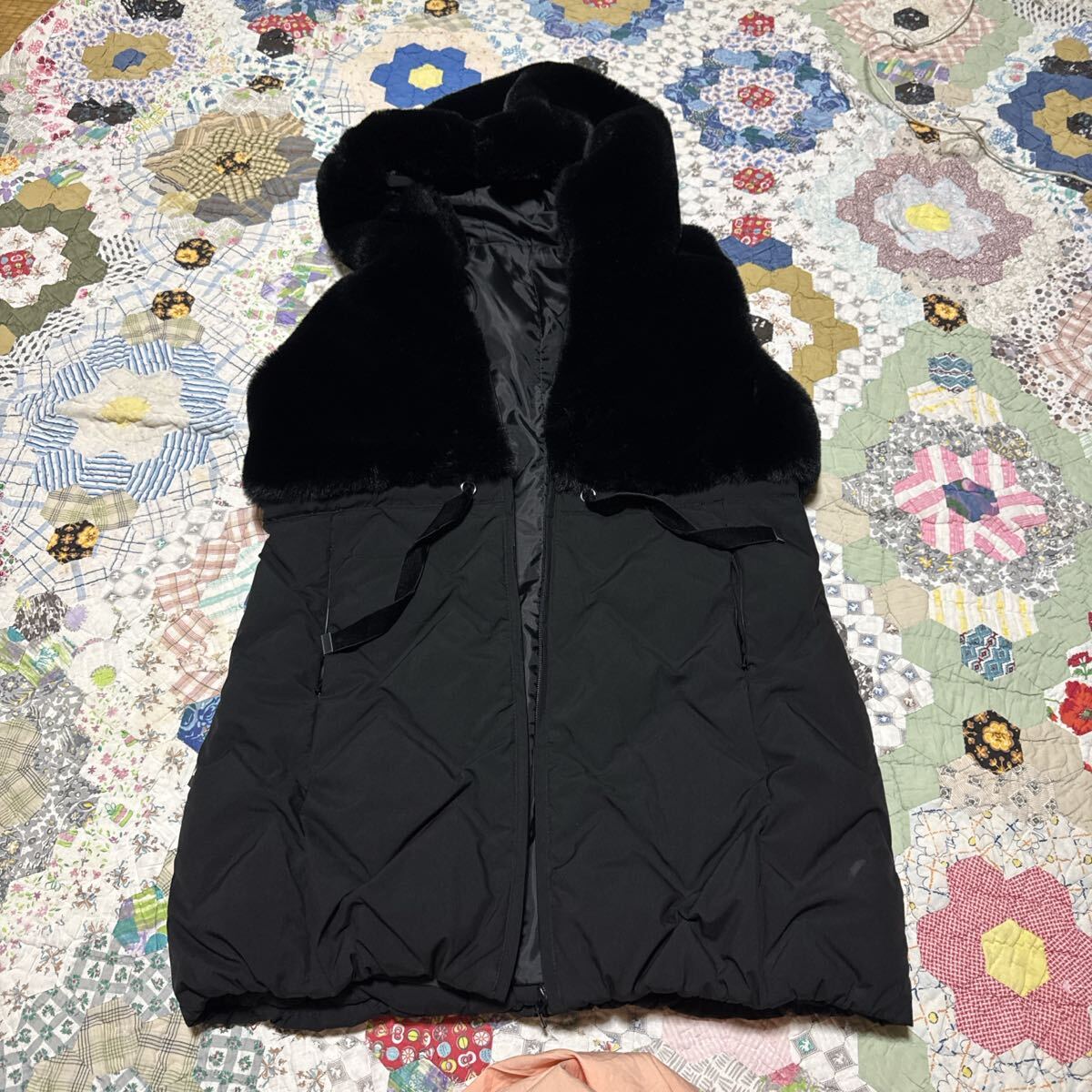 フード付きのブラックダウンジャケット、フェイクファー付きで暖かさとスタイルを両立。切り替え ドッキング エコファー