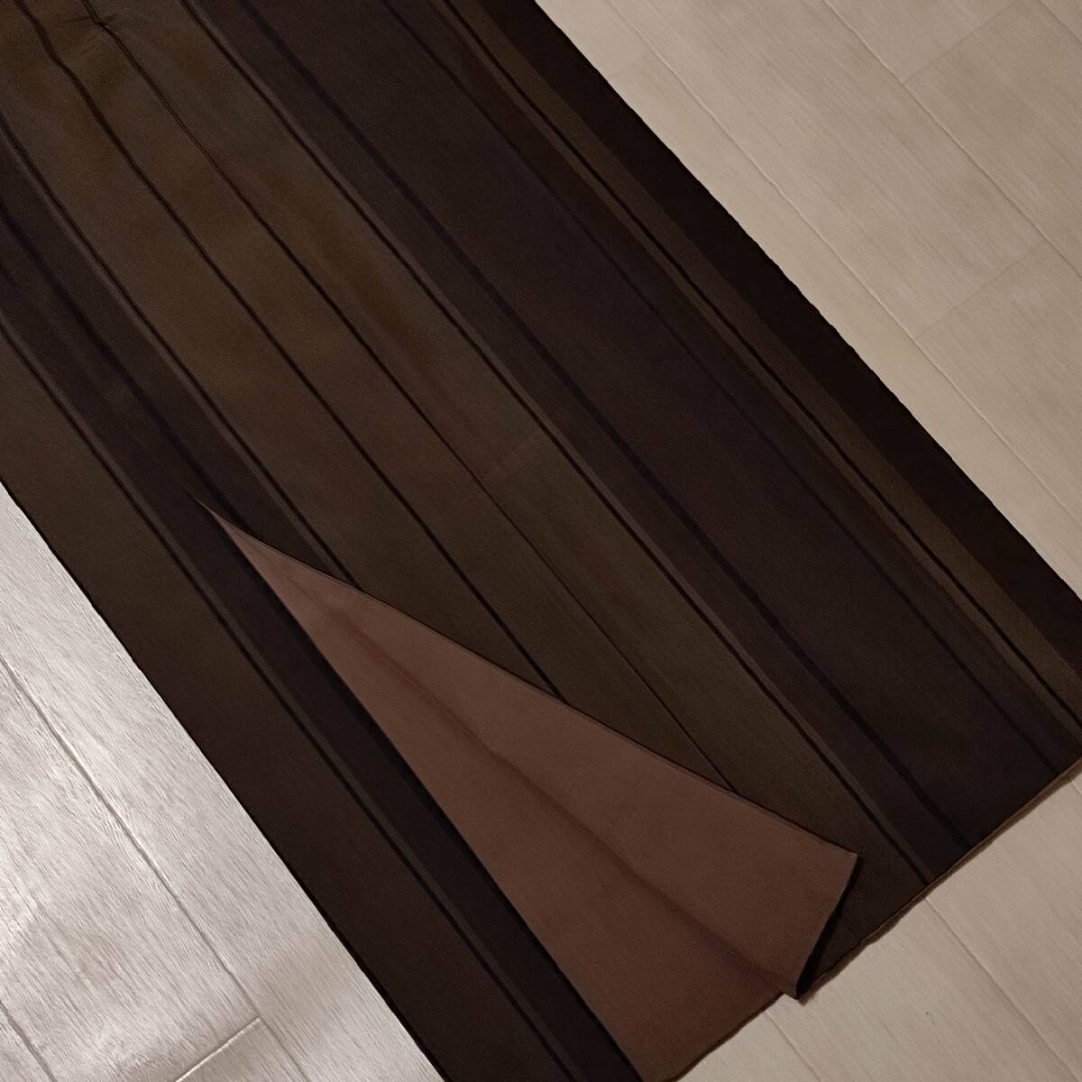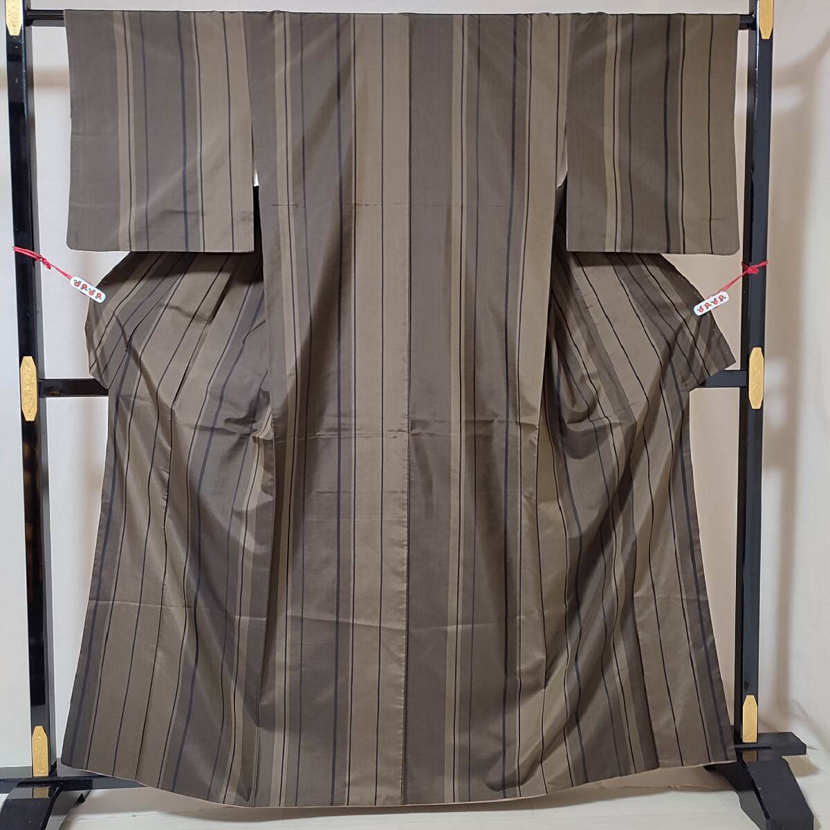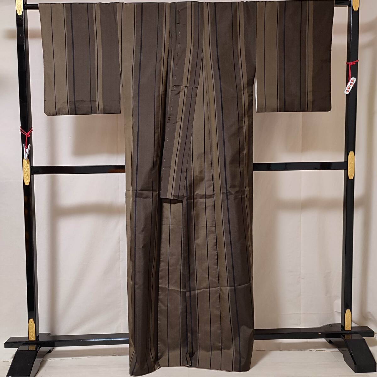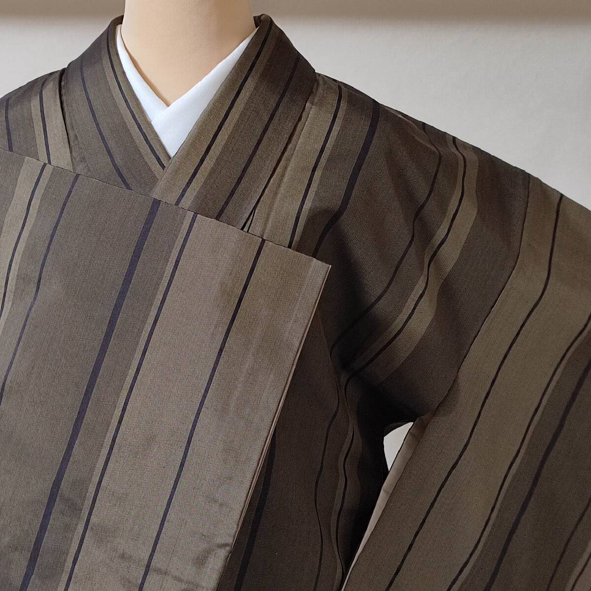 即決■着物の越田■裄66身丈162.5 正絹 小紋 袷 縦縞 ストライプ カーキ系■め23E07