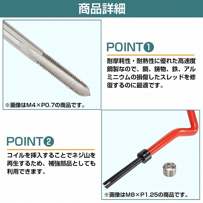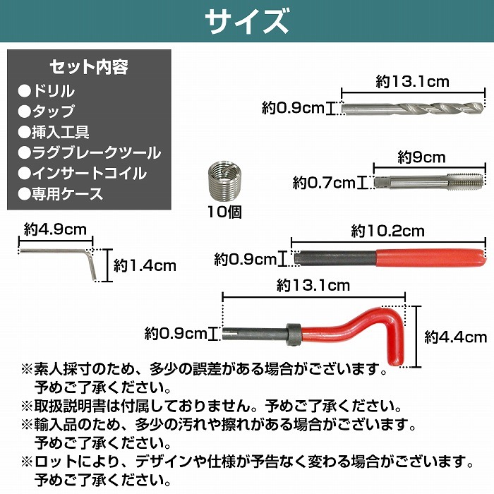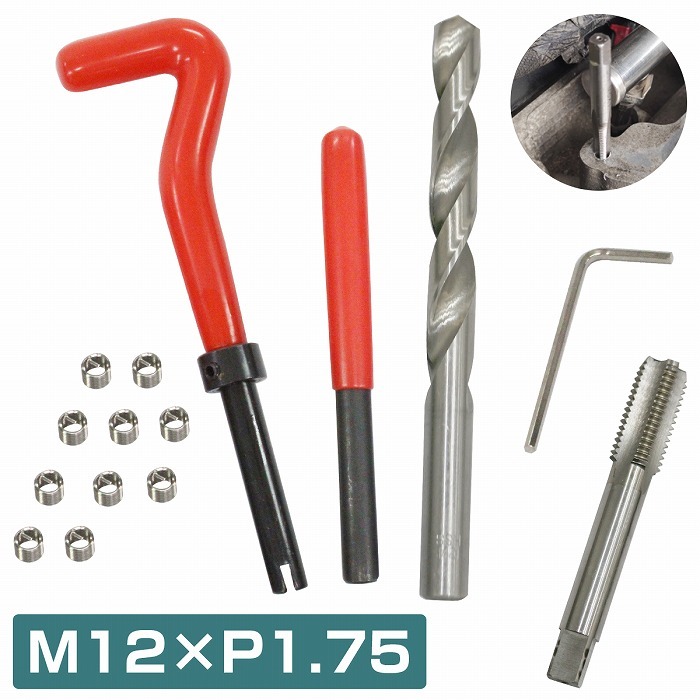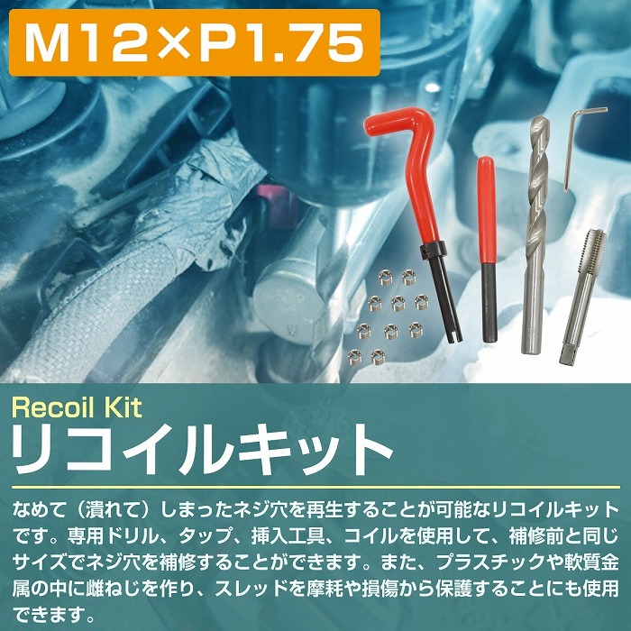 【送料無料】『M12×P1.75』リコイルキット ネジ 山 修正 ドリル付き めねじ 再生 ねじ 穴 修復 補強 耐久性向上 雌ネジ 補修 工具 セット