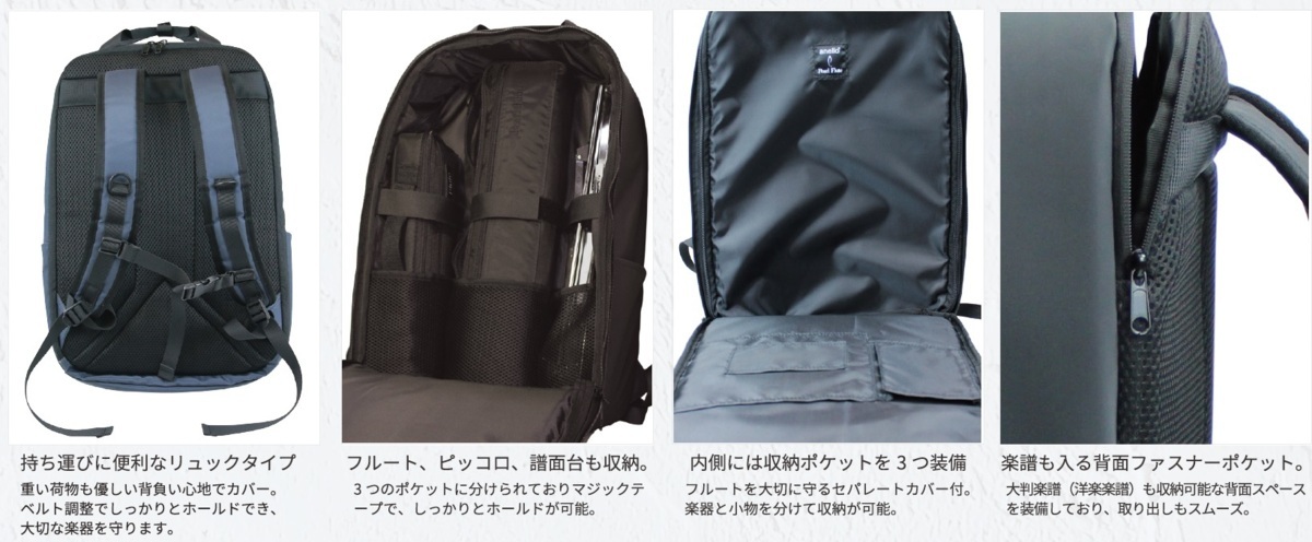 ・フルート収納ポケット:C足部管 / H足部管、ピッコロ、譜面台対応。