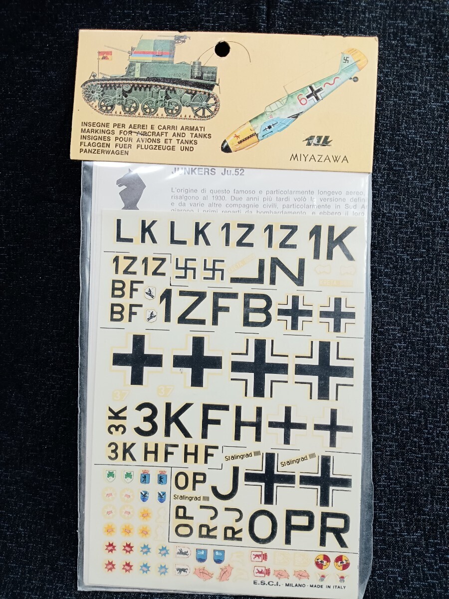 今回は、「ユンカースJu.52」用のデッドストック・デカールです、内容確認のため開封致しました。デカールの他、美しいカラーチャートと部隊マーク(解説付)も付属します。未使用品ですが、長期保管による経年変化があるため100円スタートと致します。写真のものが全てです、定形郵便で発送予定です。不明点がありましたら問い合わせ下さい。